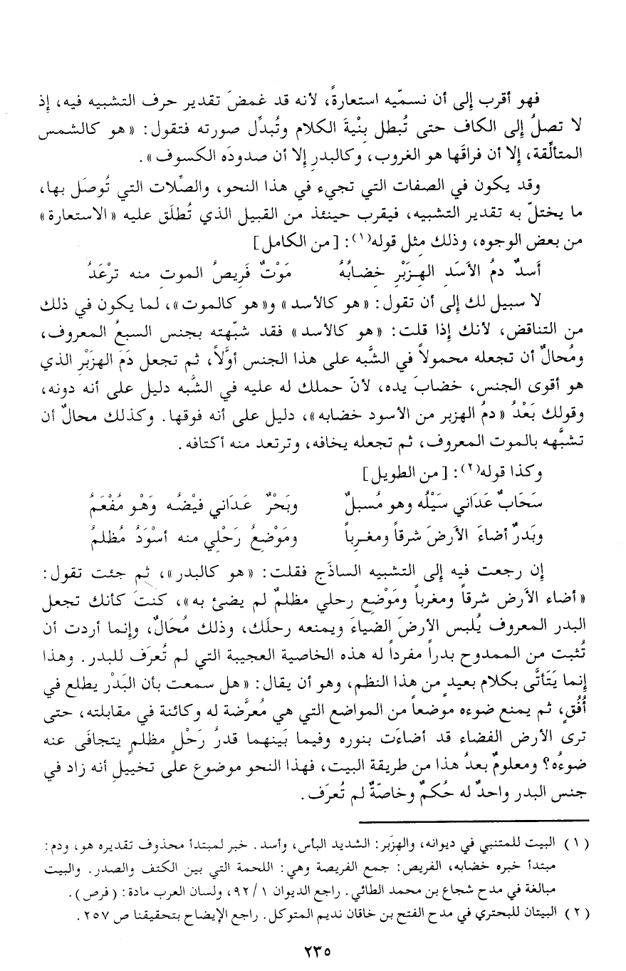 «أضاء الأرض شرقا ومغربا وموضع رحلي مظلم لم يضئ به»، كنت كأنك تجعل البدر المعروف يلبس الأرض الضياء ويمنعه رحلك، وذلك محال، وإنما أردت أن تثبت من الممدوح بدرا مفردا له هذه الخاصية العجيبة التي لم تعرف للبدر. وهذا إنما يتأتّى بكلام بعيد من هذا النظم، وهو أن يقال: «هل سمعت بأن البدر يطلع في أفق، ثم يمنع ضوءه موضعا من المواضع التي هي معرّضة له وكائنة في مقابلته، حتى ترى الأرض الفضاء قد أضاءت بنوره وفيما بينهما قدر رحل مظلم يتجافى عنه ضوؤه؟ ومعلوم بعد هذا من طريقة البيت، فهذا النحو موضوع على تخييل أنه زاد في جنس البدر واحد له حكم وخاصّة لم تعرف.