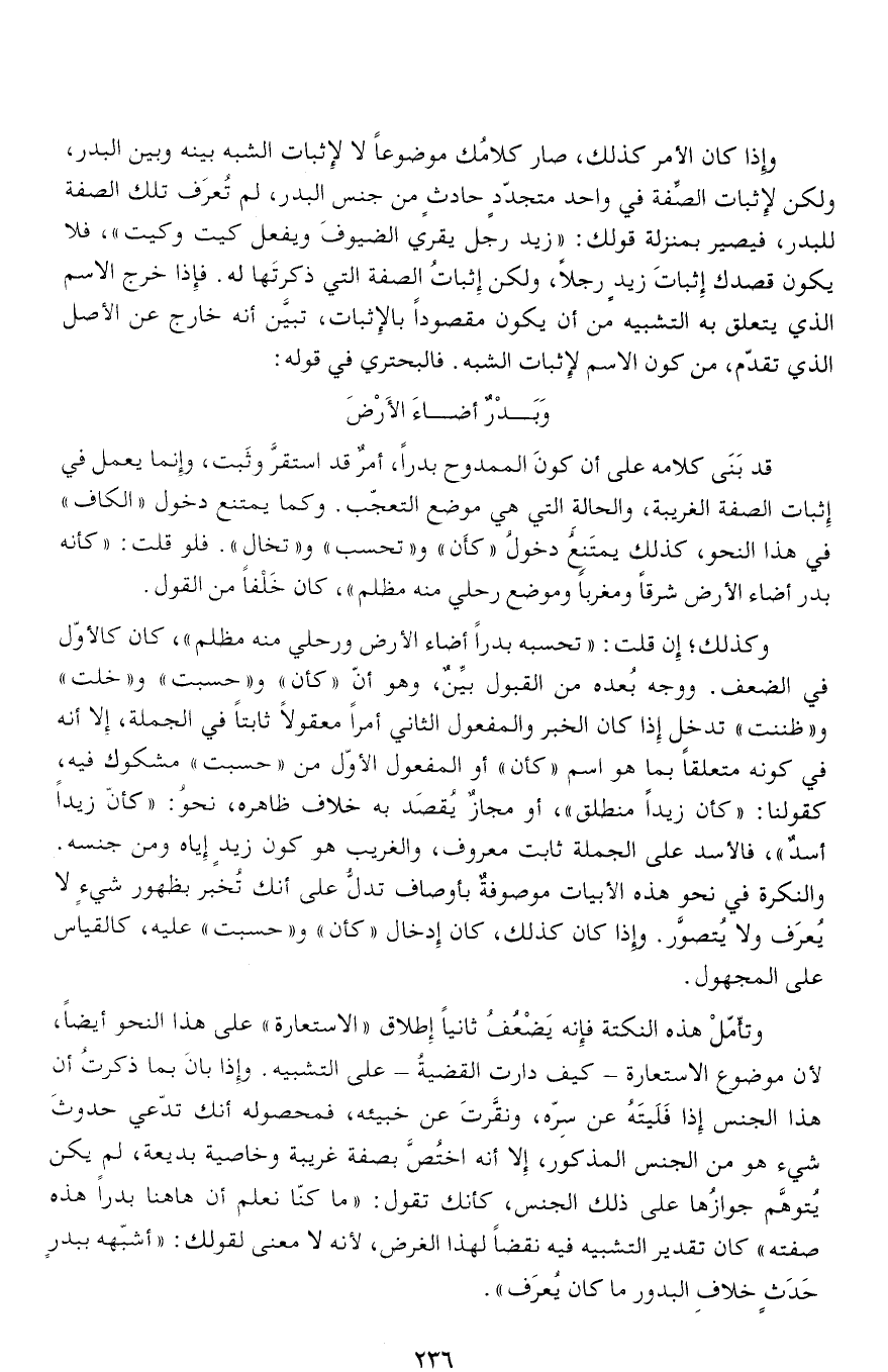 وبدر أضاء الأرض قد بنى كلامه على أن كون الممدوح بدرا، أمر قد استقرّ وثبت، وإنما يعمل في إثبات الصفة الغريبة، والحالة التي هي موضع التعجّب. وكما يمتنع دخول «الكاف» في هذا النحو، كذلك يمتنع دخول «كأن» و «تحسب» و «تخال». فلو قلت: «كأنه بدر أضاء الأرض شرقا ومغربا وموضع رحلي منه مظلم»، كان خلفا من القول.