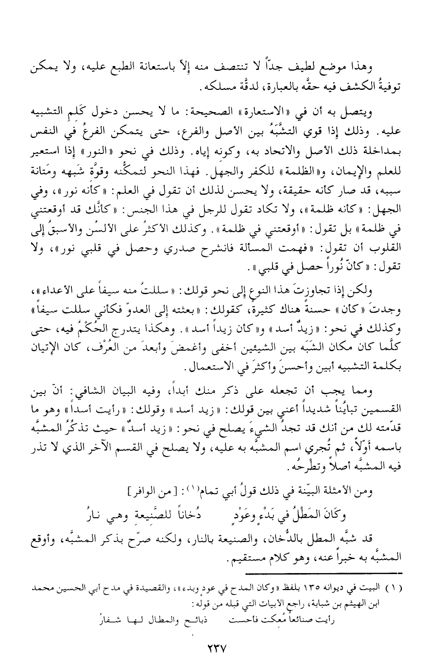 ويتصل به أن في «الاستعارة» الصحيحة: ما لا يحسن دخول كلم التشبيه عليه. وذلك إذا قوي التشبّه بين الأصل والفرع، حتى يتمكن الفرع في النفس بمداخلة ذلك الأصل والاتحاد به، وكونه إياه. وذلك في نحو «النور» إذا استعير للعلم والإيمان، و «الظلمة» للكفر والجهل. فهذا النحو لتمكّنه وقوّة شبهه ومتانة سببه، قد صار كأنه حقيقة، ولا يحسن لذلك أن تقول في العلم: «كأنه نور»، وفي الجهل: «كأنه ظلمة»، ولا تكاد تقول للرجل في هذا الجنس: «كأنّك قد أوقعتني في ظلمة» بل تقول: «أوقعتني في ظلمة». وكذلك الأكثر على الألسن والأسبق إلى القلوب أن تقول: «فهمت المسألة فانشرح صدري وحصل في قلبي نور»، ولا تقول: «كأنّ نورا حصل في قلبي».