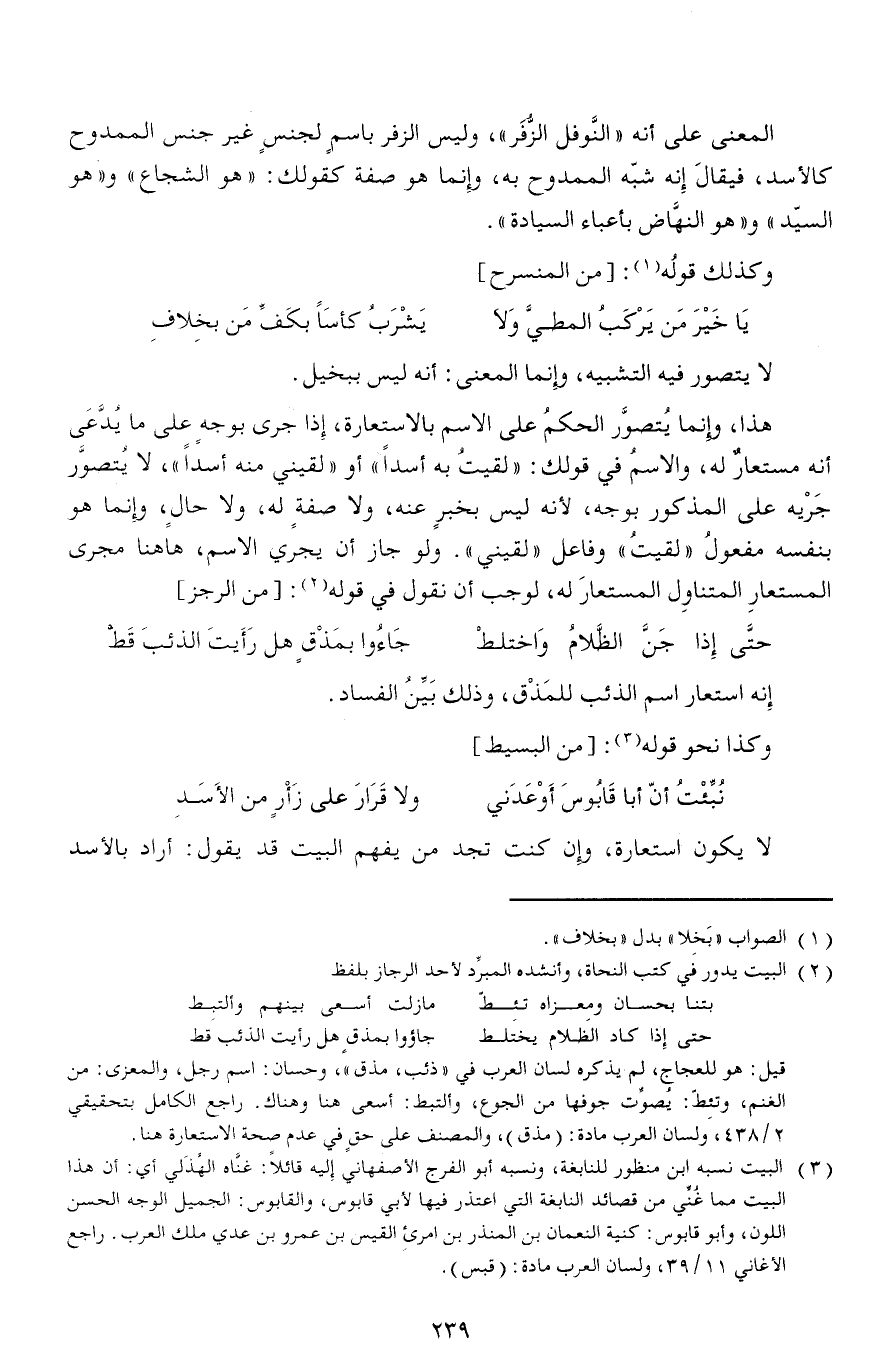 المعنى على أنه «النّوفل الزّفر»، وليس الزفر باسم لجنس غير جنس الممدوح كالأسد، فيقال إنه شبّه الممدوح به، وإنما هو صفة كقولك: «هو الشجاع» و «هو السيّد» و «هو النهّاض بأعباء السيادة».
