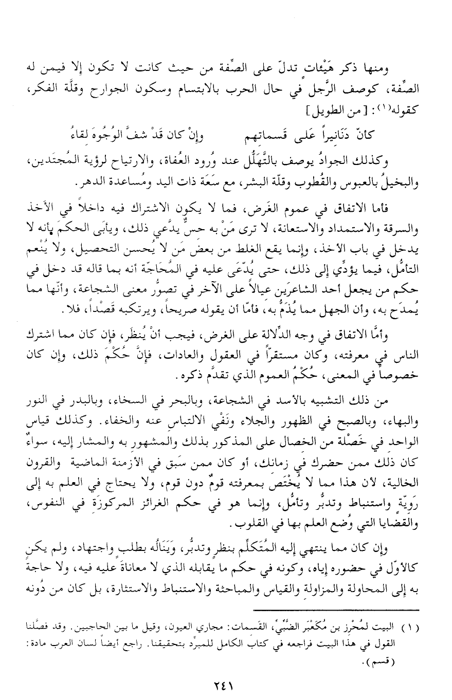فأما الاتفاق في عموم الغرض، فما لا يكون الاشتراك فيه داخلا في الأخذ والسرقة والاستمداد والاستعانة، لا ترى من به حسّ يدّعي ذلك، ويأبى الحكم بأنه لا يدخل في باب الأخذ، وإنما يقع الغلط من بعض من لا يحسن التحصيل، ولا ينعم التأمّل، فيما يؤدّي إلى ذلك، حتى يدّعى عليه في المحاجّة أنه بما قاله قد دخل في حكم من يجعل أحد الشاعرين عيالا على الآخر في تصوّر معنى الشجاعة، وأنّها مما يمدح به، وأن الجهل مما يذمّ به، فأمّا أن يقوله صريحا، ويرتكبه قصدا، فلا.