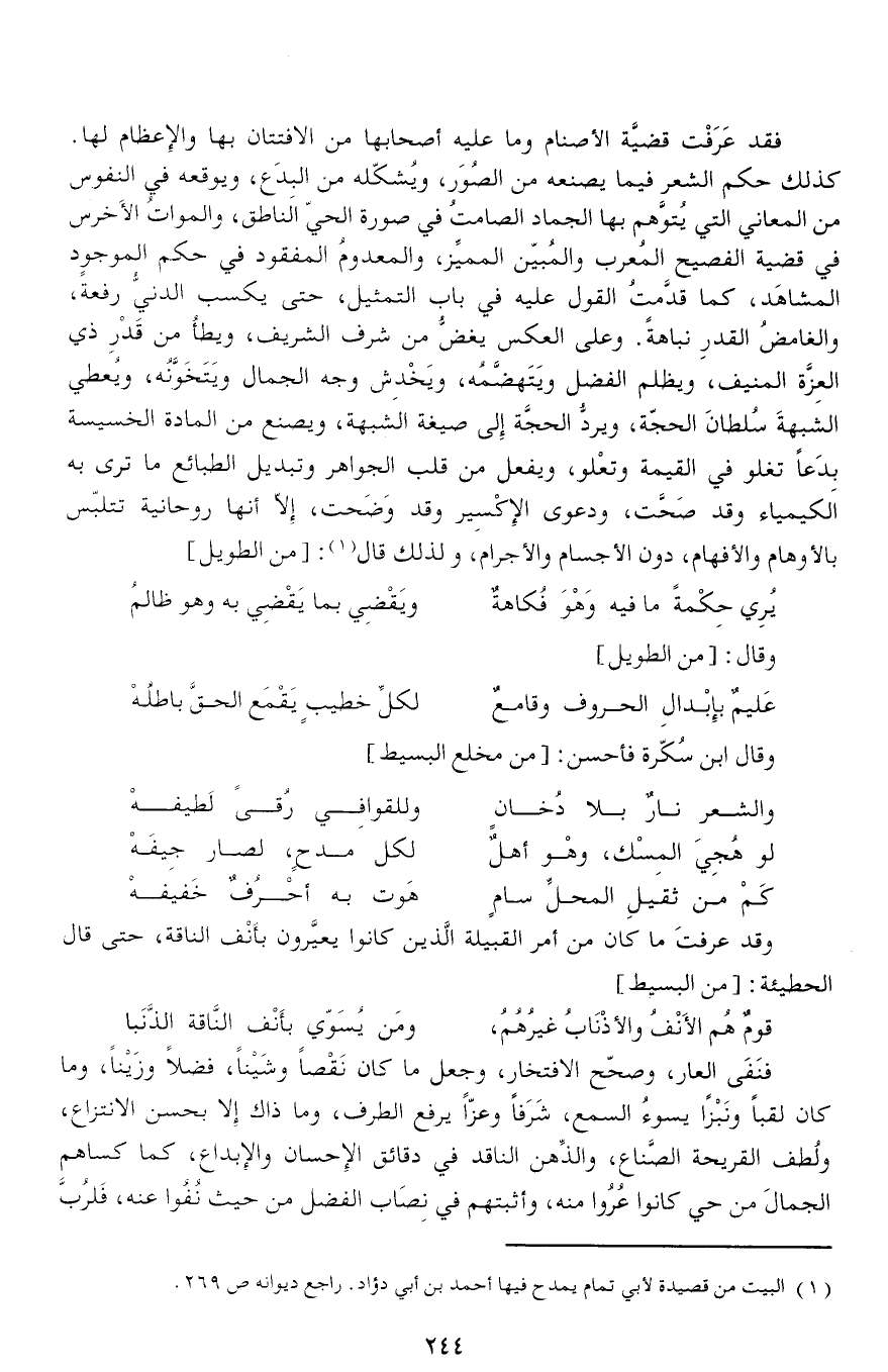 كذلك حكم الشعر فيما يصنعه من الصور، ويشكّله من البدع، ويوقعه في النفوس من المعاني التي يتوهّم بها الجماد الصامت في صورة الحيّ الناطق، والموات الأخرس في قضية الفصيح المعرب والمبيّن المميّز، والمعدوم المفقود في حكم الموجود المشاهد، كما قدّمت القول عليه في باب التمثيل، حتى يكسب الدنيّ رفعة، والغامض القدر نباهة. وعلى العكس يغضّ من شرف الشريف، ويطأ من قدر ذي العزّة المنيف، ويظلم الفضل ويتهضّمه، ويخدش وجه الجمال ويتخوّنه، ويعطي الشبهة سلطان الحجّة، ويردّ الحجّة إلى صيغة الشبهة، ويصنع من المادة الخسيسة بدعا تغلو في القيمة وتعلو، ويفعل من قلب الجواهر وتبديل الطبائع ما ترى به الكيمياء وقد صحّت، ودعوى الإكسير وقد وضحت، إلّا أنها روحانية تتلبّس بالأوهام والأفهام، دون الأجسام والأجرام، ولذلك قال (¬1): [من الطويل]