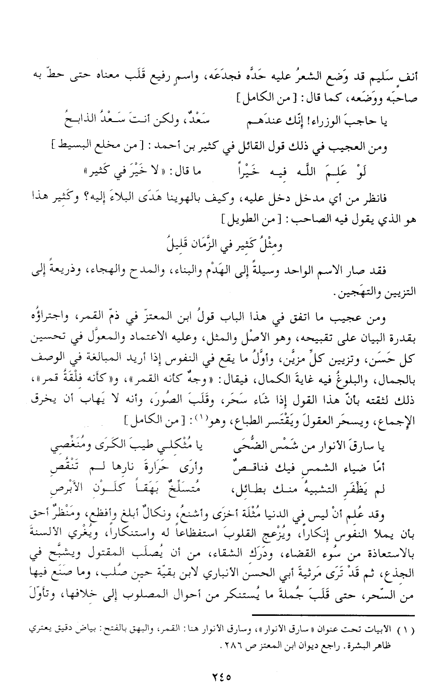 ومن عجيب ما اتفق في هذا الباب قول ابن المعتزّ في ذمّ القمر، واجتراؤه بقدرة البيان على تقبيحه، وهو الأصل والمثل، وعليه الاعتماد والمعوّل في تحسين كل حسن، وتزيين كلّ مزيّن، وأوّل ما يقع في النفوس إذا أريد المبالغة في الوصف بالجمال، والبلوغ فيه غاية الكمال، فيقال: «وجه كأنه القمر»، و «كأنه فلقة قمر»، ذلك لثقته بأنّ هذا القول إذا شاء سحر، وقلب الصور، وأنه لا يهاب أن يخرق الإجماع، ويسحر العقول ويقتسر الطباع، وهو (¬1): [من الكامل]