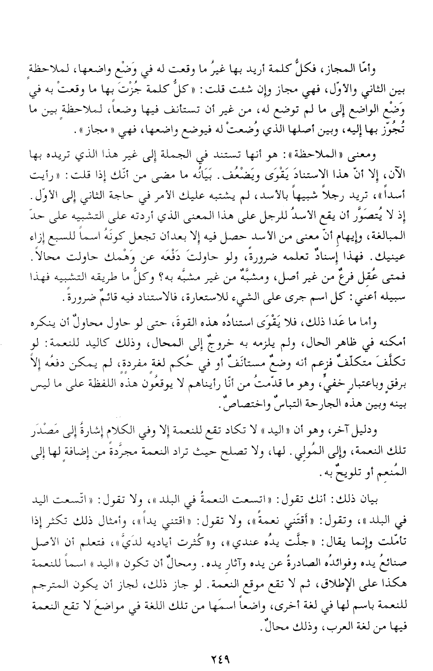 بيان ذلك: أنك تقول: «اتسعت النعمة في البلد»، ولا تقول: «اتّسعت اليد في البلد»، وتقول: «أقتني نعمة»، ولا تقول: «اقتني يدا»، وأمثال ذلك تكثر إذا تأمّلت وإنما يقال: «جلّت يده عندي»، و «كثرت أياديه لديّ»، فتعلم أن الأصل صنائع يده وفوائده الصادرة عن يده وآثار يده. ومحال أن تكون «اليد» اسما للنعمة هكذا على الإطلاق، ثم لا تقع موقع النعمة. لو جاز ذلك، لجاز أن يكون المترجم للنعمة باسم لها في لغة أخرى، واضعا اسمها من تلك اللغة في مواضع لا تقع النعمة فيها من لغة العرب، وذلك محال.