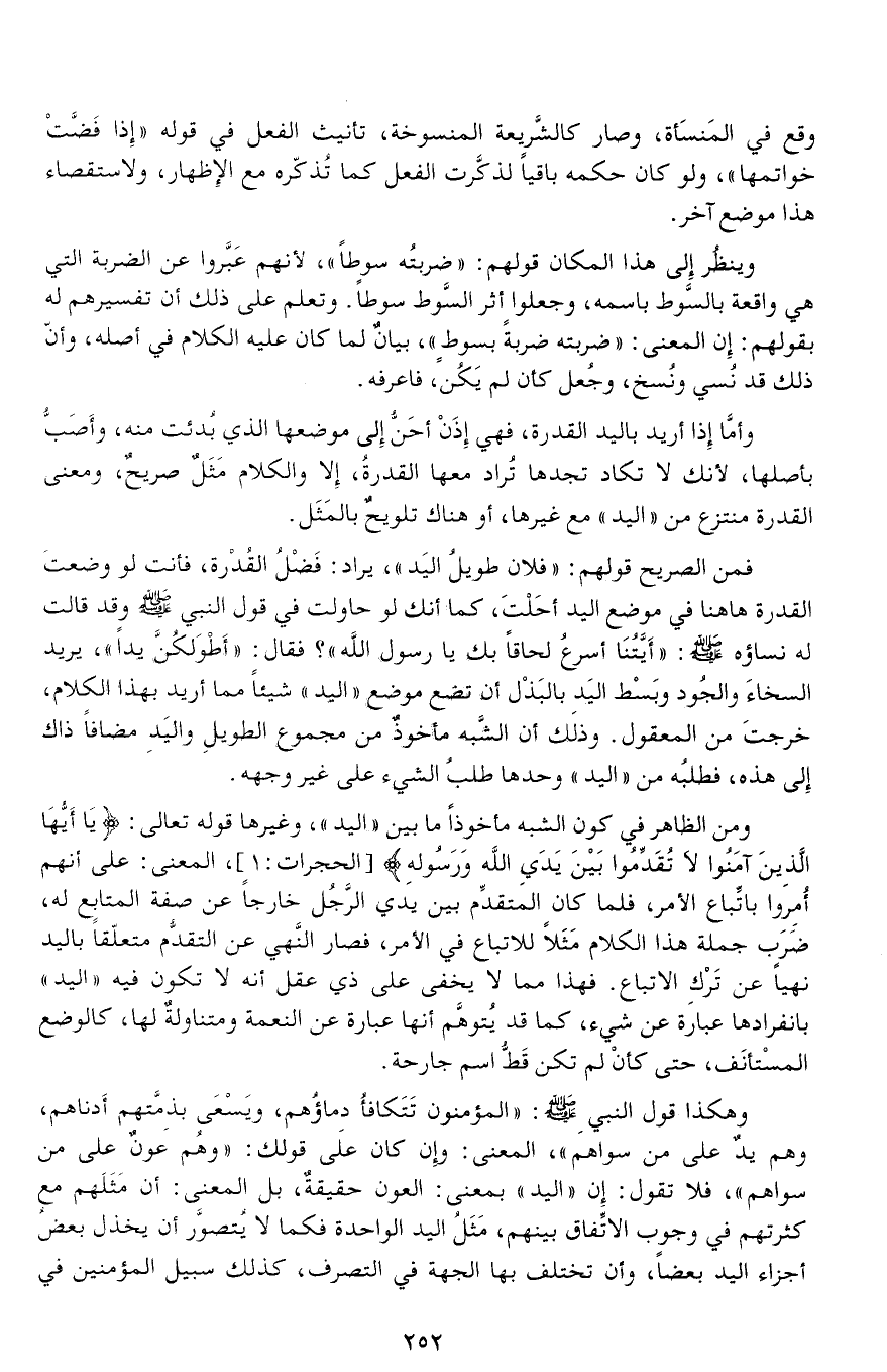 وهكذا قول النبي صلّى الله عليه وسلّم: «المؤمنون تتكافأ دماؤهم، ويسعى بذمّتهم أدناهم، وهم يد على من سواهم»، المعنى: وإن كان على قولك: «وهم عون على من سواهم»، فلا تقول: إن «اليد» بمعنى: العون حقيقة، بل المعنى: أن مثلهم مع كثرتهم في وجوب الاتّفاق بينهم، مثل اليد الواحدة فكما لا يتصوّر أن يخذل بعض أجزاء اليد بعضا، وأن تختلف بها الجهة في التصرف، كذلك سبيل المؤمنين في
