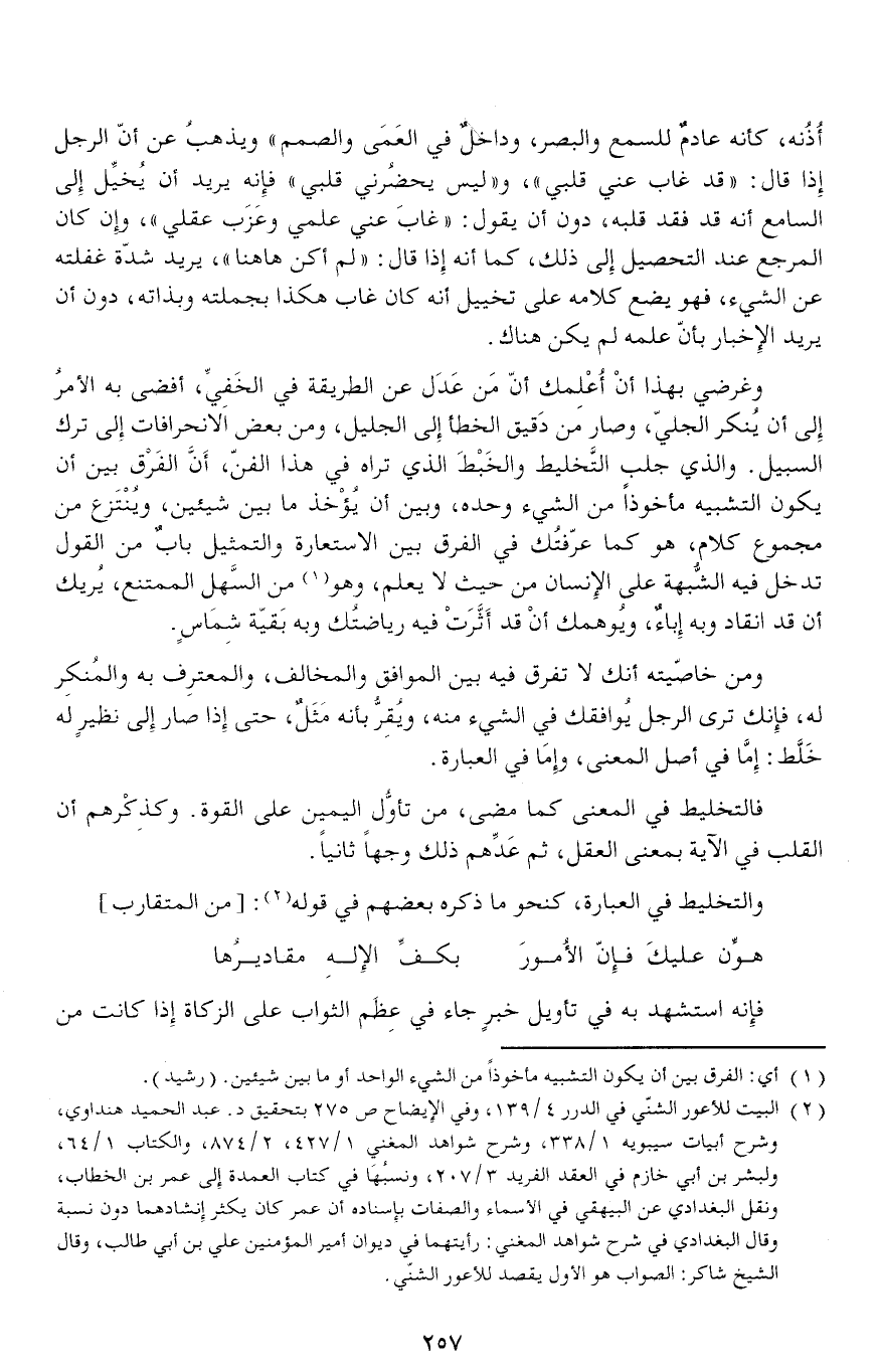 ومن خاصّيته أنك لا تفرق فيه بين الموافق والمخالف، والمعترف به والمنكر له، فإنك ترى الرجل يوافقك في الشيء منه، ويقرّ بأنه مثل، حتى إذا صار إلى نظير له خلّط: إمّا في أصل المعنى، وإما في العبارة.