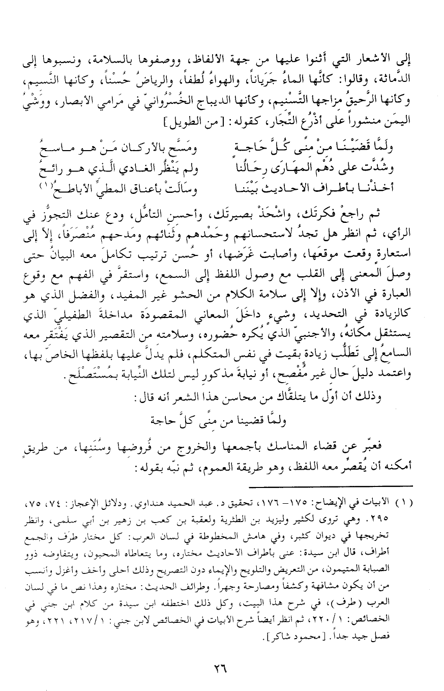 (¬1) الأبيات في الإيضاح: 175 - 176، تحقيق د. عبد الحميد هنداوي. ودلائل الإعجاز: 74، 75، 295. وهي تروى لكثير وليزيد بن الطثرية ولعقبة بن كعب بن زهير بن أبي سلمى، وانظر تخريجها في ديوان كثير، وفي هامش المخطوطة في لسان العرب: كل مختار طرف والجمع أطراف، قال ابن سيدة: عنى بأطراف الأحاديث مختاره، وما يتعاطاه المحبون، ويتفاوضه ذوو الصبابة المتيمون، من التعريض والتلويح والإيماء دون التصريح وذلك أحلى وأخف وأغزل وأنسب من أن يكون مشافهة وكشفا ومصارحة وجهرا. وطرائف الحديث: مختاره وهذا نص ما في لسان العرب (طرف)، في شرح هذا البيت، وكل ذلك اختطفه ابن سيدة من كلام ابن جني في الخصائص: 1/ 220، ثم انظر أيضا شرح الأبيات في الخصائص لابن جني: 1/ 217، 221، وهو فصل جيد جدا. [محمود شاكر].