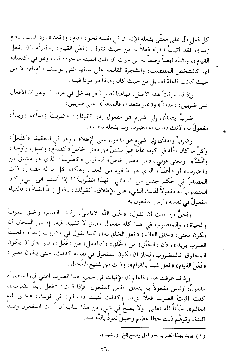 وأحقّ من ذلك أن تقول: «خلق الله الأناسيّ، وأنشأ العالم، وخلق الموت والحياة»، والمنصوب في هذا كله مفعول مطلق لا تقييد فيه، إذ من المحال أن يكون معنى: «خلق العالم» «فعل الخلق به»، كما تقول في «ضربت زيدا» «فعلت الضرب بزيد»، لأن «الخلق» من «خلق» «كالفعل» من «فعل»، فلو جاز أن يكون المخلوق كالمضروب، لجاز أن يكون المفعول في نفسه كذلك، حتى يكون معنى:
