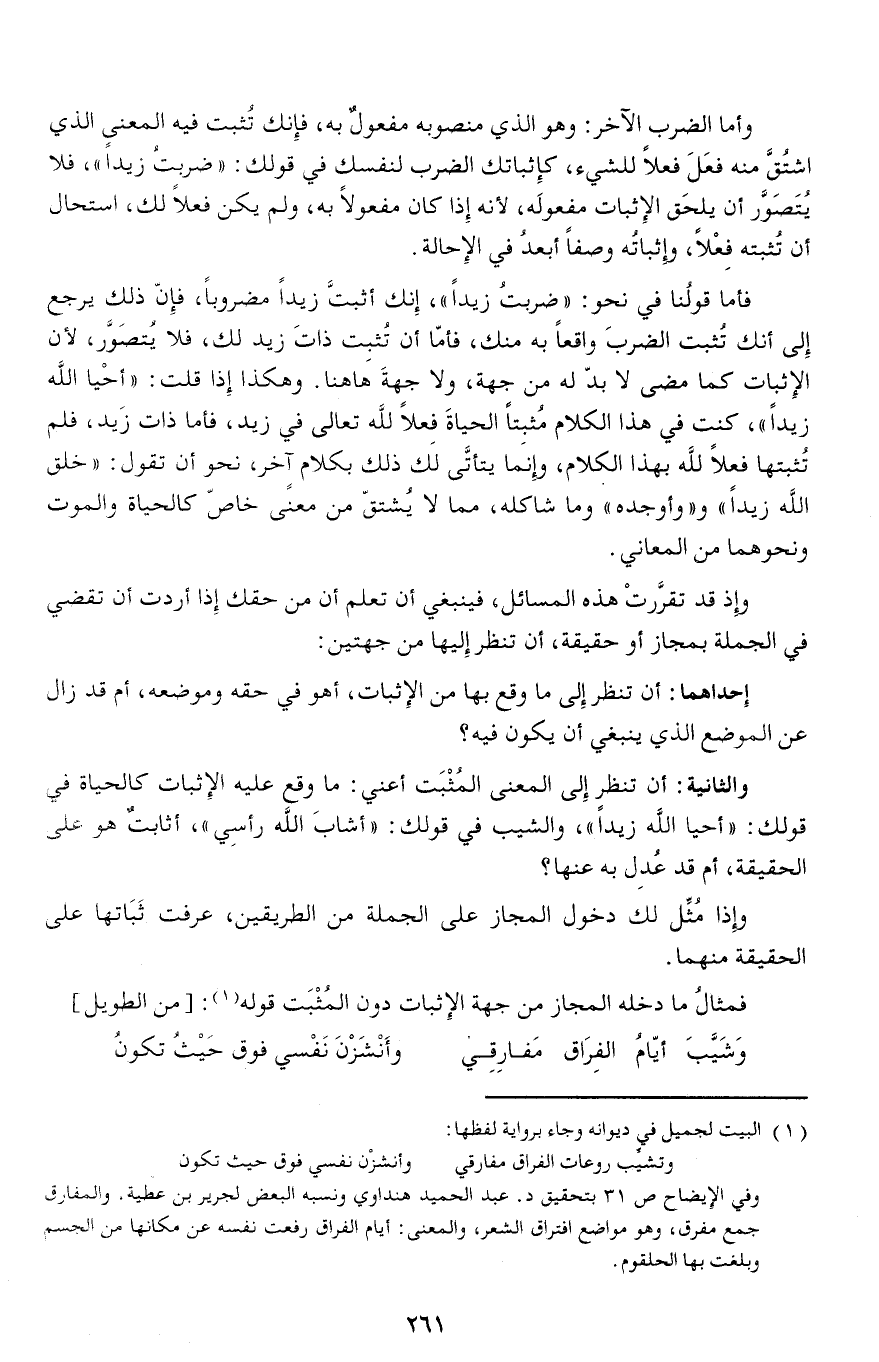 فأما قولنا في نحو: «ضربت زيدا»، إنك أثبتّ زيدا مضروبا، فإنّ ذلك يرجع إلى أنك تثبت الضرب واقعا به منك، فأمّا أن تثبت ذات زيد لك، فلا يتصوّر، لأن الإثبات كما مضى لا بدّ له من جهة، ولا جهة هاهنا. وهكذا إذا قلت: «أحيا الله زيدا»، كنت في هذا الكلام مثبتا الحياة فعلا لله تعالى في زيد، فأما ذات زيد، فلم تثبتها فعلا لله بهذا الكلام، وإنما يتأتّى لك ذلك بكلام آخر، نحو أن تقول: «خلق الله زيدا» و «وأوجده» وما شاكله، مما لا يشتقّ من معنى خاصّ كالحياة والموت ونحوهما من المعاني.