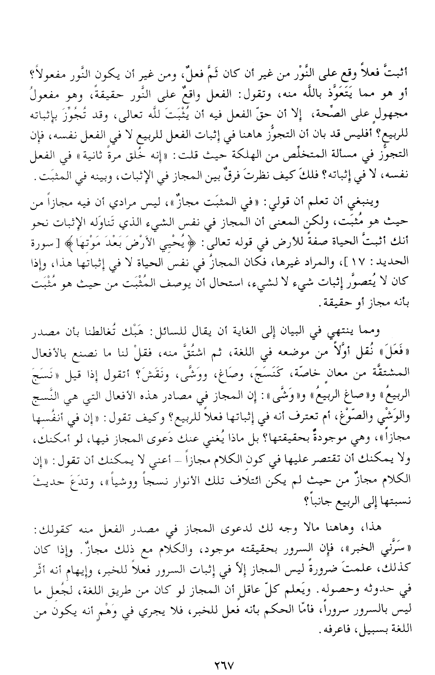 أو هو مما يتعوّذ بالله منه، وتقول: الفعل واقع على النّور حقيقة، وهو مفعول مجهول على الصّحة، إلا أن حقّ الفعل فيه أن يثبت لله تعالى، وقد تجوّز بإثباته للربيع؟ أفليس قد بان أن التجوّز هاهنا في إثبات الفعل للربيع لا في الفعل نفسه، فإن التجوّز في مسألة المتخلّص من الهلكة حيث قلت: «إنه خلق مرة ثانية» في الفعل نفسه، لا في إثباته؟ فلك كيف نظرت فرق بين المجاز في الإثبات، وبينه في المثبت.