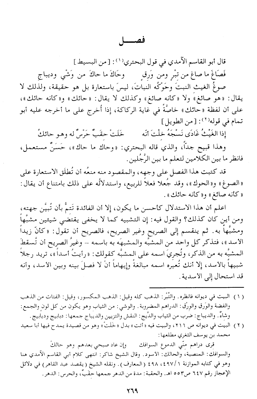 صوغ الغيث النبت وحوكه النبات، ليس باستعارة بل هو حقيقة، ولذلك لا يقال: «هو صائغ» ولا «كأنه صائغ» وكذلك لا يقال: «حائك» و «كأنه حائك»، على أن لفظة «حائك» خاصّة في غاية الركاكة، إذا أخرج على ما أخرجه عليه أبو تمام في قوله (¬2): [من الطويل]