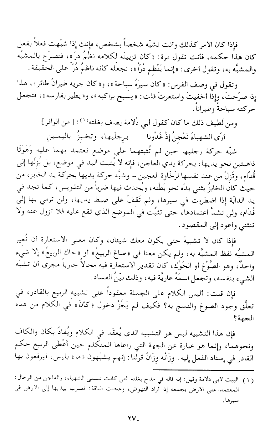 فإن هذا التشبيه ليس هو التشبيه الذي يعقد في الكلام ويفاد بكأن والكاف ونحوهما، وإنما هو عبارة عن الجهة التي راعاها المتكلم حين أعطى الربيع حكم القادر في إسناد الفعل إليه. وزانه وزان قولنا: إنهم يشبّهون «ما» بليس، فيرفعون بها