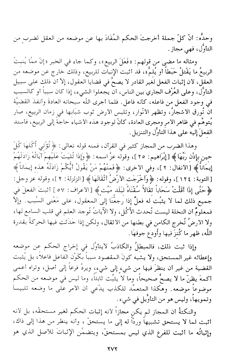 والنكتة أن المجاز لم يكن مجازا لأنه إثبات الحكم لغير مستحقّه، بل لأنه أثبت لما لا يستحق تشبيها وردّا له إلى ما يستحقّ، وأنه ينظر من هذا إلى ذاك، وإثباته ما أثبت للفرع الذي ليس بمستحقّ، ويتضمّن الإثبات للأصل الذي هو