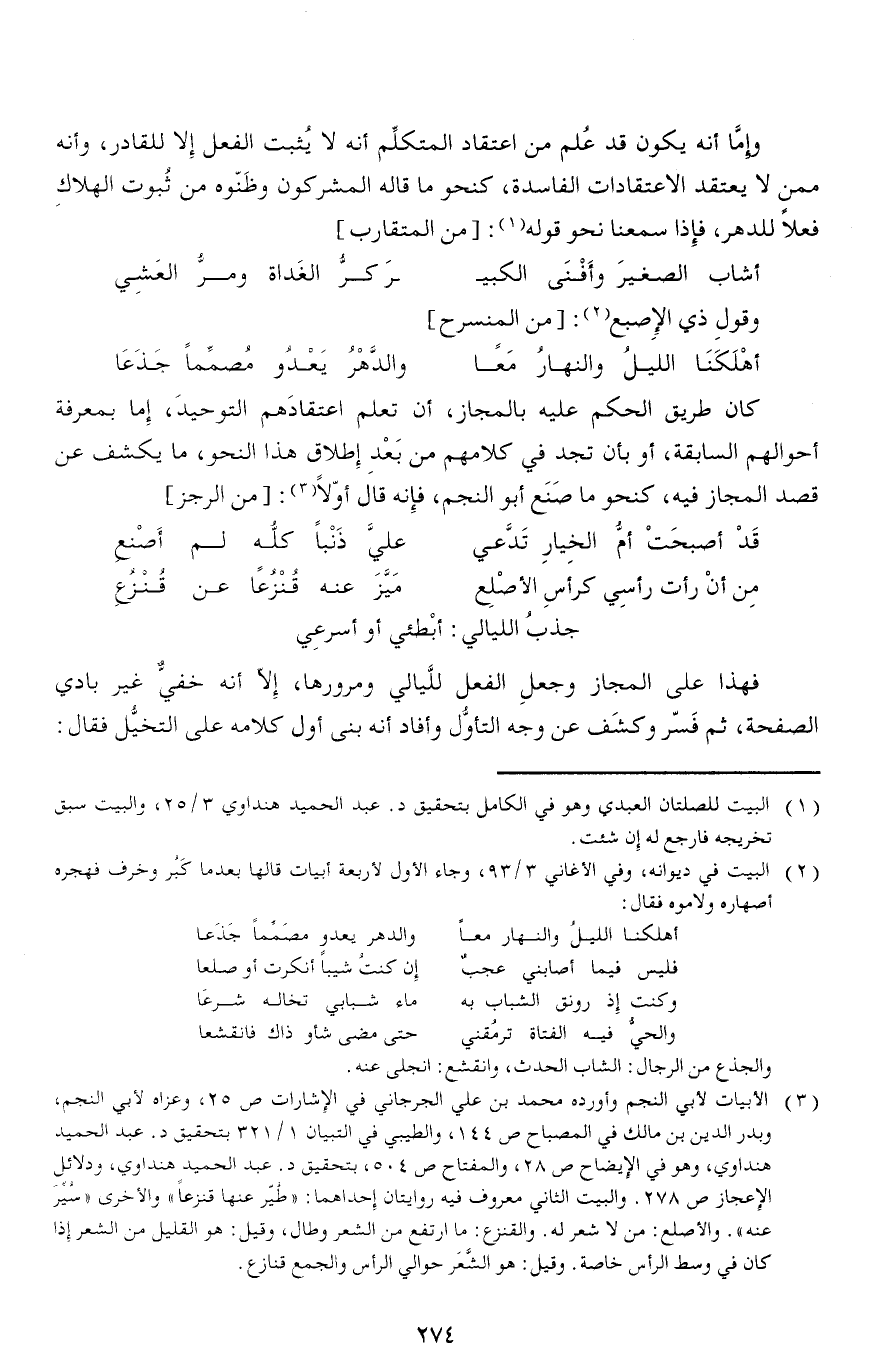 كان طريق الحكم عليه بالمجاز، أن تعلم اعتقادهم التوحيد، إما بمعرفة أحوالهم السابقة، أو بأن تجد في كلامهم من بعد إطلاق هذا النحو، ما يكشف عن قصد المجاز فيه، كنحو ما صنع أبو النجم، فإنه قال أوّلا (¬3): [من الرجز]