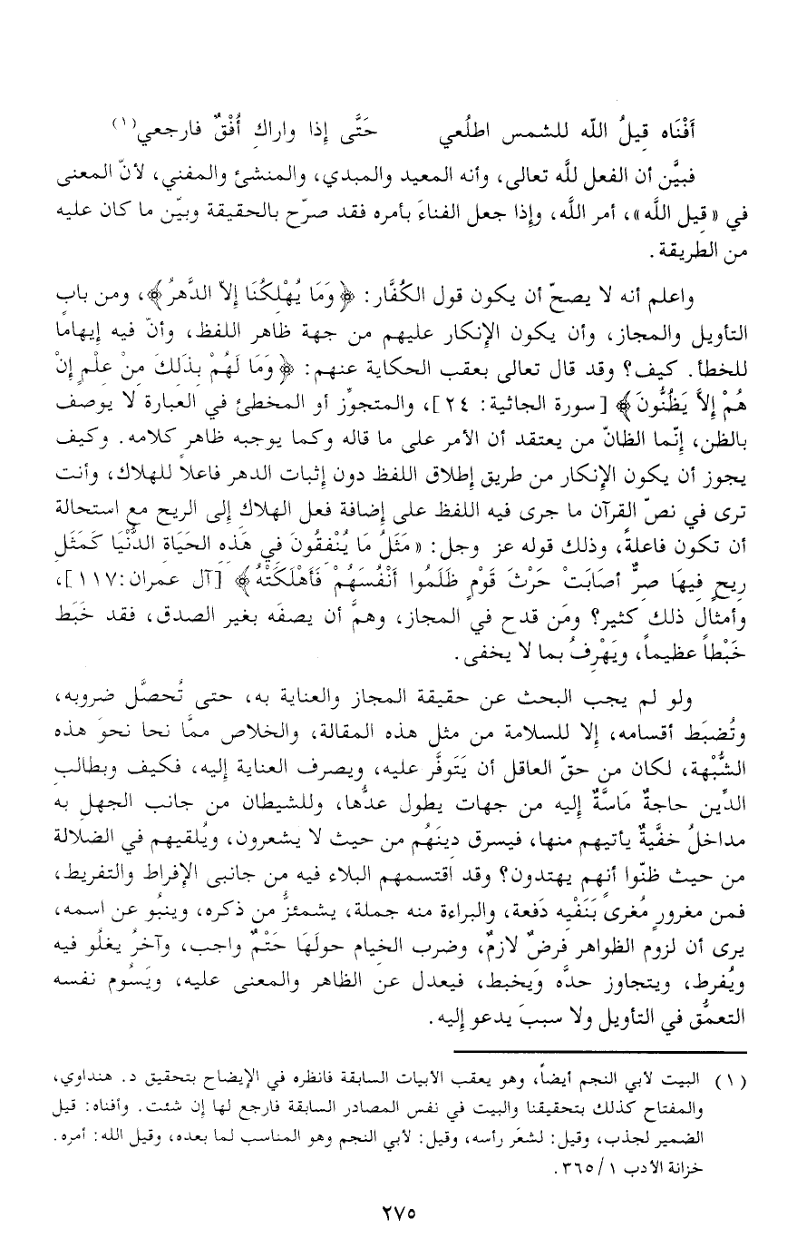 فبيّن أن الفعل لله تعالى، وأنه المعيد والمبدي، والمنشئ والمفني، لأنّ المعنى في «قيل الله»، أمر الله، وإذا جعل الفناء بأمره فقد صرّح بالحقيقة وبيّن ما كان عليه من الطريقة.