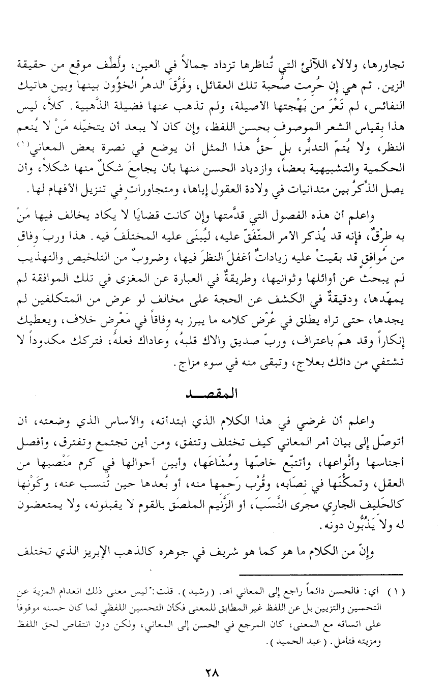 واعلم أن غرضي في هذا الكلام الذي ابتدأته، والأساس الذي وضعته، أن أتوصّل إلى بيان أمر المعاني كيف تختلف وتتفق، ومن أين تجتمع وتفترق، وأفصل أجناسها وأنواعها، وأتتبّع خاصّها ومشاعها، وأبين أحوالها في كرم منصبها من العقل، وتمكّنها في نصابه، وقرب رحمها منه، أو بعدها حين تنسب عنه، وكونها كالحليف الجاري مجرى النّسب، أو الزّنيم الملصق بالقوم لا يقبلونه، ولا يمتعضون له ولا يذبّون دونه.