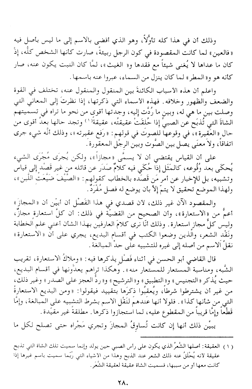 والمقصود الآن غير ذلك، لأن قصدي في هذا الفصل أن أبيّن أن «المجاز» أعمّ من «الاستعارة»، وأن الصحيح من القضيّة في ذلك: أن كلّ استعارة مجاز، وليس كلّ مجاز استعارة. وذلك أنّا نرى كلام العارفين بهذا الشأن أعني علم الخطابة ونقد الشعر، والّذين وضعوا الكتب في أقسام البديع، يجري على أن «الاستعارة» نقل الاسم من أصله إلى غيره للتشبيه على حدّ المبالغة.