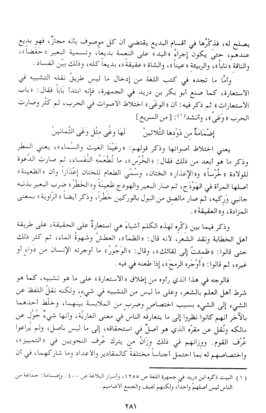 فالوجه في هذا الذي رأوه من إطلاق «الاستعارة» على ما هو تشبيه، كما هو شرط أهل العلم بالشعر، وعلى ما ليس من التشبيه في شيء، ولكنه نقل اللفظ عن الشيء إلى الشيء بسبب اختصاص وضرب من الملابسة بينهما، وخلط أحدهما بالآخر أنهم كانوا نظروا إلى ما يتعارفه الناس في معنى العاريّة، وأنها شيء حوّل عن مالكه ونقل عن مقرّه الذي هو أصل في استحقاقه، إلى ما ليس بأصل، ولم يراعوا عرف القوم. ووزانهم في ذلك وزان من يترك عرف النحويين في «التمييز»، واختصاصهم له بما احتمل أجناسا مختلفة كالمقادير والأعداد وما شاركهما، في أن