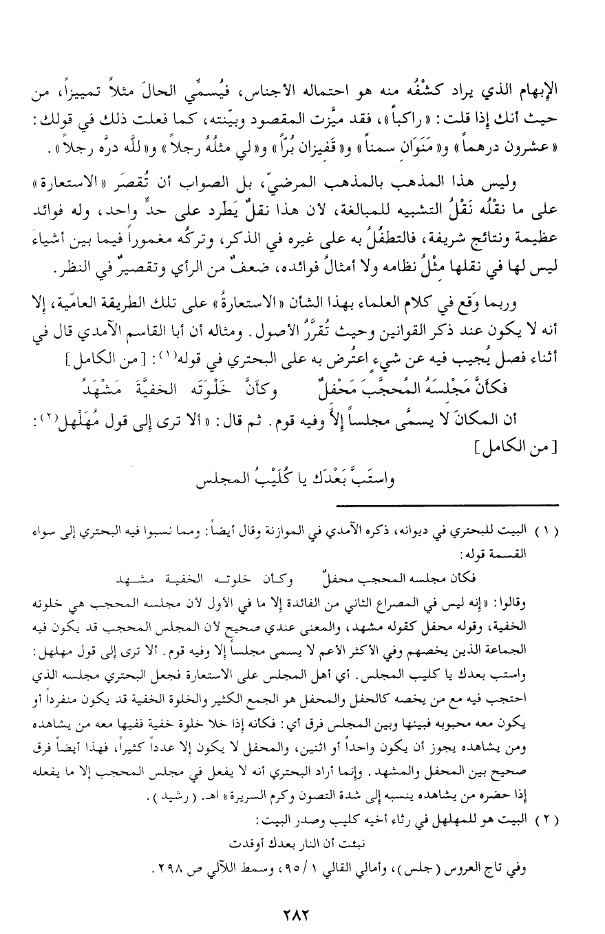 وربما وقع في كلام العلماء بهذا الشأن «الاستعارة» على تلك الطريقة العامّية، إلا أنه لا يكون عند ذكر القوانين وحيث تقرّر الأصول. ومثاله أن أبا القاسم الآمدي قال في أثناء فصل يجيب فيه عن شيء اعترض به على البحتري في قوله (¬1): [من الكامل]