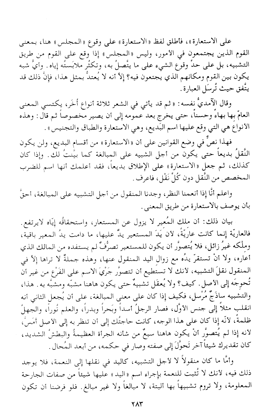 فالعاريّة إنما كانت عاريّة، لأن يد المستعير يد عليها، ما دامت يد المعير باقية، وملكه غير زائل، فلا يتصوّر أن يكون للمستعير تصرّف لم يستفده من المالك الذي أعاره، ولا أن تستقرّ يده مع زوال اليد المنقول عنها، وهذه جملة لا تراها إلّا في المنقول نقل التشبيه، لأنك لا تستطيع أن تتصوّر جري الاسم على الفرع من غير أن تحوجه إلى الأصل. كيف؟ ولا يعقل تشبيه حتى يكون هاهنا مشبّه ومشبّه به. هذا، والتشبيه ساذج مرسل، فكيف إذا كان على معنى المبالغة، على أن يجعل الثاني أنه انقلب مثلا إلى جنس الأوّل، فصار الرجل أسدا وبحرا وبدرا، والعلم نورا، والجهل ظلمة، لأنّه إذا كان على هذا الوجه، كانت حاجتك إلى أن تنظر به إلى الأصل أمسّ، لأنه إذا لم يتصوّر أن يكون هاهنا سبع من شأنه الجرأة العظيمة والبطش الشديد، كان تقديرك شيئا آخر تحوّل إلى صفته وصار في حكمه، من أبعد المحال.