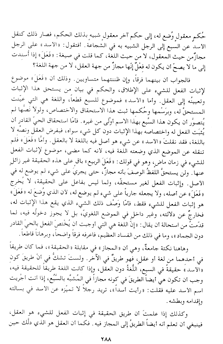 الشبيه به في الشجاعة. أفتقول: «الأسد» على الرجل مجاز من حيث المعقول، لا من حيث اللغة، كما قلت في صيغة: «فعل» إذا أسندت إلى ما لا يصحّ أن يكون له فعل إنّها مجاز من جهة العقل، لا من جهة اللغة؟