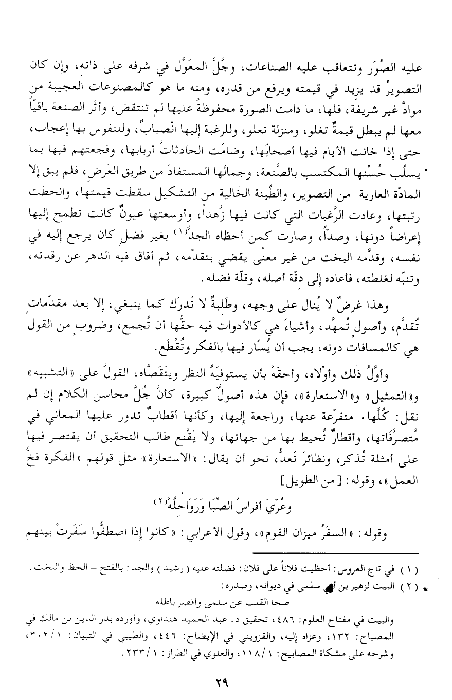وأوّل ذلك وأولاه، وأحقّه بأن يستوفيه النظر ويتقصّاه، القول على «التشبيه» و «التمثيل» و «الاستعارة»، فإن هذه أصول كبيرة، كأنّ جلّ محاسن الكلام إن لم نقل: كلّها، متفرّعة عنها، وراجعة إليها، وكأنها أقطاب تدور عليها المعاني في متصرّفاتها، وأقطار تحيط بها من جهاتها، ولا يقنع طالب التحقيق أن يقتصر فيها على أمثلة تذكر،