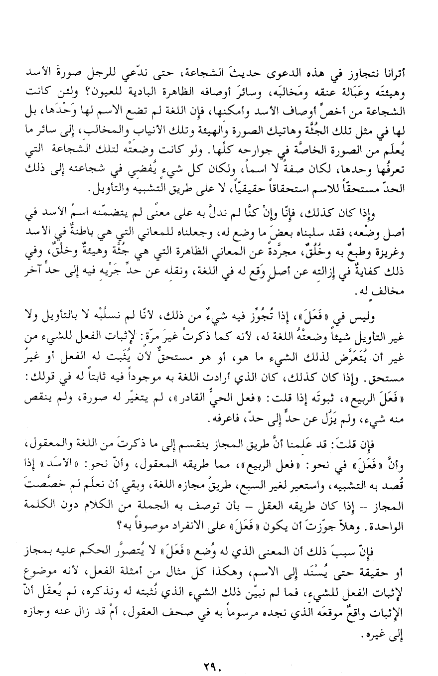 أترانا نتجاوز في هذه الدعوى حديث الشجاعة، حتى ندّعي للرجل صورة الأسد وهيئته وعبالة عنقه ومخالبه، وسائر أوصافه الظاهرة البادية للعيون؟ ولئن كانت الشجاعة من أخصّ أوصاف الأسد وأمكنها، فإن اللغة لم تضع الاسم لها وحدها، بل لها في مثل تلك الجثّة وهاتيك الصورة والهيئة وتلك الأنياب والمخالب، إلى سائر ما يعلم من الصورة الخاصّة في جوارحه كلّها. ولو كانت وضعته لتلك الشجاعة التي تعرفها وحدها، لكان صفة لا اسما، ولكان كل شيء يفضي في شجاعته إلى ذلك الحدّ مستحقّا للاسم استحقاقا حقيقيّا، لا على طريق التشبيه والتأويل.