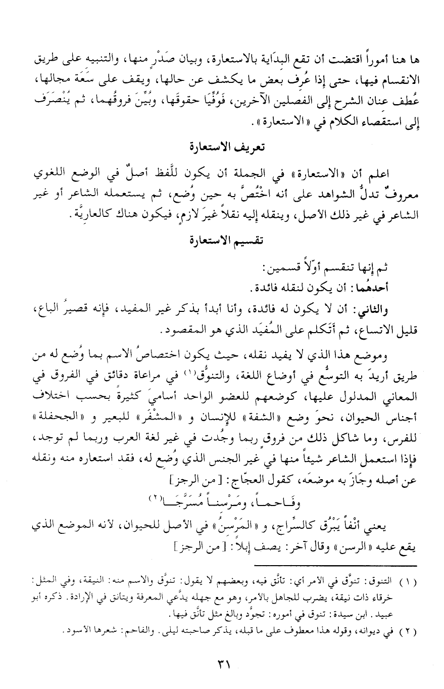 اعلم أن «الاستعارة» في الجملة أن يكون للّفظ أصل في الوضع اللغوي معروف تدلّ الشواهد على أنه اختصّ به حين وضع، ثم يستعمله الشاعر أو غير الشاعر في غير ذلك الأصل، وينقله إليه نقلا غير لازم، فيكون هناك كالعارية.