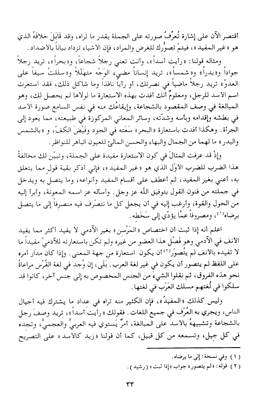 وليس كذلك «المفيد»، فإن الكثير منه تراه في عداد ما يشترك فيه أجيال الناس، ويجري به العرف في جميع اللغات. فقولك «رأيت أسدا»، تريد وصف رجل بالشجاعة وتشبيهه بالأسد على المبالغة، أمر يستوي فيه العربيّ والعجميّ، وتجده في كل جيل، وتسمعه من كل قبيل، كما أن قولنا «زيد كالأسد» على التصريح