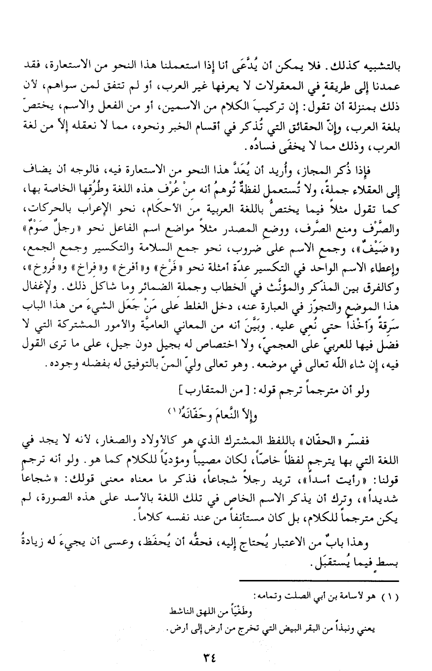 فإذا ذكر المجاز، وأريد أن يعدّ هذا النحو من الاستعارة فيه، فالوجه أن يضاف إلى العقلاء جملة، ولا تستعمل لفظة توهم أنه من عرف هذه اللغة وطرقها الخاصة بها، كما تقول مثلا فيما يختصّ باللغة العربية من الأحكام، نحو الإعراب بالحركات، والصّرف ومنع الصّرف، ووضع المصدر مثلا مواضع اسم الفاعل نحو «رجل صوم» و «ضيف»، وجمع الاسم على ضروب، نحو جمع السلامة والتكسير وجمع الجمع، وإعطاء الاسم الواحد في التكسير عدّة أمثلة نحو «فرخ» و «أفرخ» و «فراخ» و «فروخ»، وكالفرق بين المذكّر والمؤنّث في الخطاب وجملة الضمائر وما شاكل ذلك. ولإغفال هذا الموضع والتجوّز في العبارة عنه، دخل الغلط على من جعل الشيء من هذا الباب سرقة وأخذا حتى نعي عليه. وبيّن أنه من المعاني العاميّة والأمور المشتركة التي لا فضل فيها للعربيّ على العجميّ، ولا اختصاص له بجيل دون جيل، على ما ترى القول فيه، إن شاء الله تعالى في موضعه. وهو تعالى وليّ المنّ بالتوفيق له بفضله وجوده.