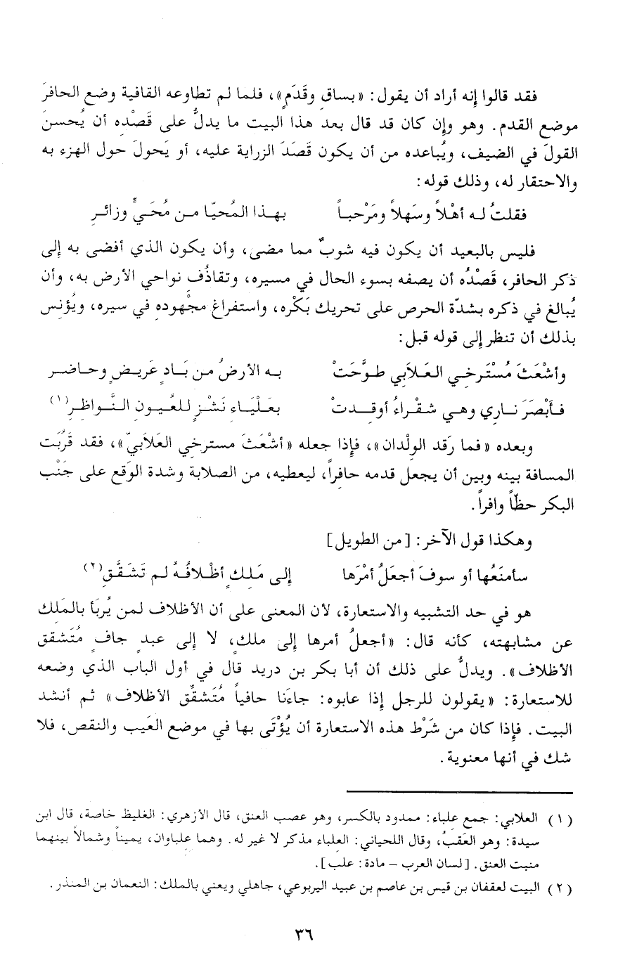 هو في حد التشبيه والاستعارة، لأن المعنى على أن الأظلاف لمن يربأ بالملك عن مشابهته، كأنه قال: «أجعل أمرها إلى ملك، لا إلى عبد جاف متشقق الأظلاف». ويدلّ على ذلك أن أبا بكر بن دريد قال في أول الباب الذي وضعه للاستعارة: «يقولون للرجل إذا عابوه: جاءنا حافيا متشقّق الأظلاف» ثم أنشد البيت. فإذا كان من شرط هذه الاستعارة أن يؤتى بها في موضع العيب والنقص، فلا شك في أنها معنوية.