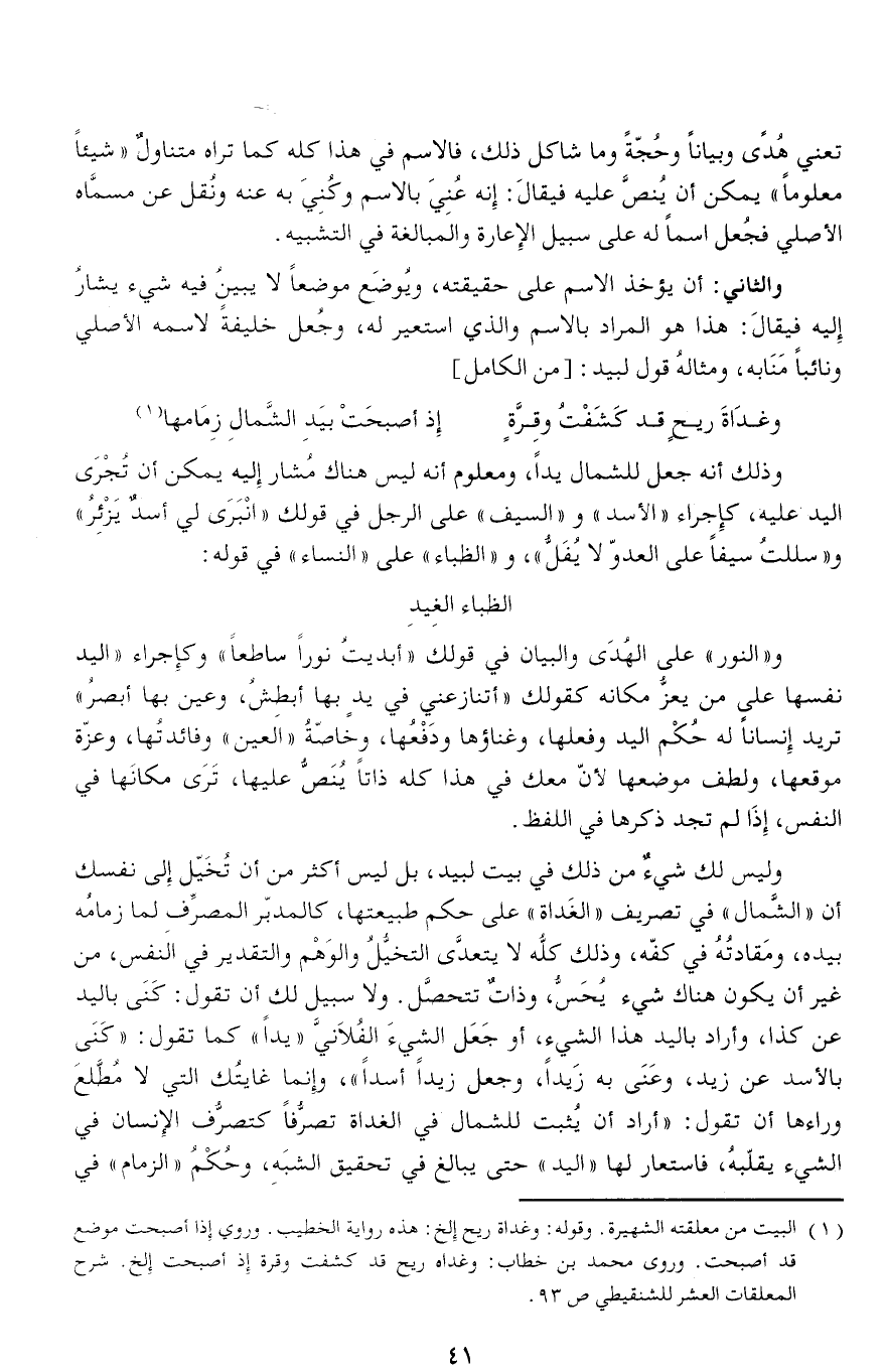 الظباء الغيد و «النور» على الهدى والبيان في قولك «أبديت نورا ساطعا» وكإجراء «اليد نفسها على من يعزّ مكانه كقولك «أتناز عني في يد بها أبطش، وعين بها أبصر» تريد إنسانا له حكم اليد وفعلها، وغناؤها ودفعها، وخاصّة «العين» وفائدتها، وعزّة موقعها، ولطف موضعها لأنّ معك في هذا كله ذاتا ينصّ عليها، ترى مكانها في النفس، إذا لم تجد ذكرها في اللفظ.
