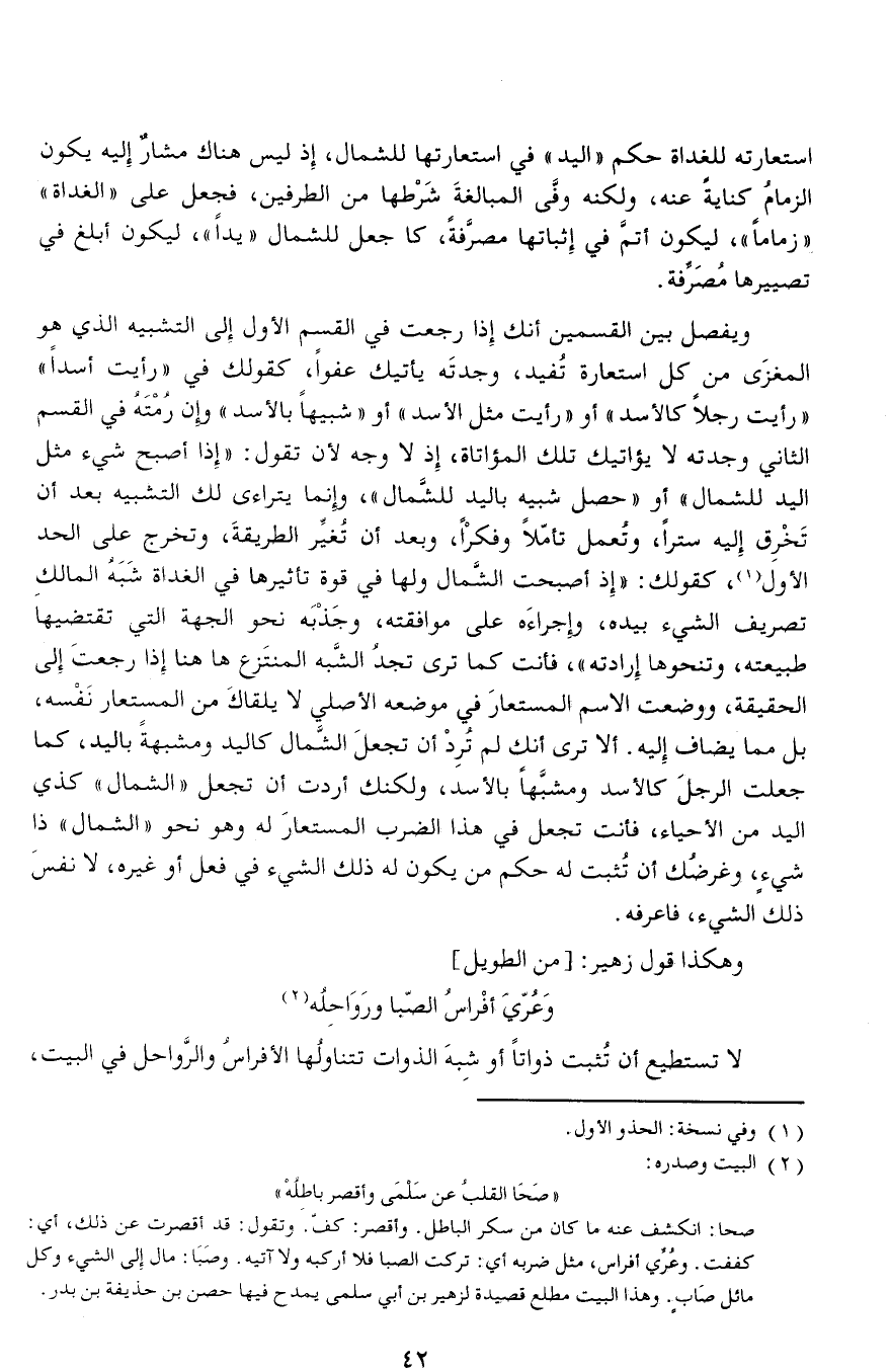 ويفصل بين القسمين أنك إذا رجعت في القسم الأول إلى التشبيه الذي هو المغزى من كل استعارة تفيد، وجدته يأتيك عفوا، كقولك في «رأيت أسدا» «رأيت رجلا كالأسد» أو «رأيت مثل الأسد» أو «شبيها بالأسد» وإن رمته في القسم الثاني وجدته لا يؤاتيك تلك المؤاتاة، إذ لا وجه لأن تقول: «إذا أصبح شيء مثل اليد للشمال» أو «حصل شبيه باليد للشّمال»، وإنما يتراءى لك التشبيه بعد أن تخرق إليه سترا، وتعمل تأمّلا وفكرا، وبعد أن تغيّر الطريقة، وتخرج على الحد الأول (¬1)، كقولك: «إذ أصبحت الشّمال ولها في قوة تأثيرها في الغداة شبه المالك تصريف الشيء بيده، وإجراءه على موافقته، وجذبه نحو الجهة التي تقتضيها طبيعته، وتنحوها إرادته»، فأنت كما ترى تجد الشّبه المنتزع هاهنا إذا رجعت إلى الحقيقة، ووضعت الاسم المستعار في موضعه الأصلي لا يلقاك من المستعار نفسه، بل مما يضاف إليه. ألا ترى أنك لم ترد أن تجعل الشّمال كاليد ومشبهة باليد، كما جعلت الرجل كالأسد ومشبّها بالأسد، ولكنك أردت أن تجعل «الشمال» كذي اليد من الأحياء، فأنت تجعل في هذا الضرب المستعار له وهو نحو «الشمال» ذا شيء، وغرضك أن تثبت له حكم من يكون له ذلك الشيء في فعل أو غيره، لا نفس ذلك الشيء، فاعرفه.