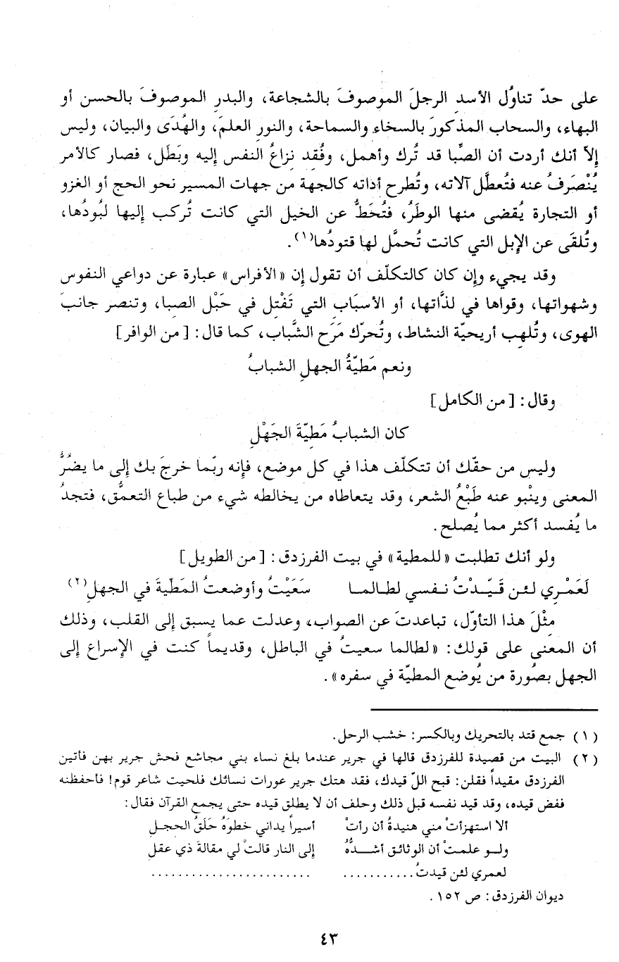 وقد يجيء وإن كان كالتكلّف أن تقول إن «الأفراس» عبارة عن دواعي النفوس وشهواتها، وقواها في لذّاتها، أو الأسباب التي تفتل في حبل الصبا، وتنصر جانب الهوى، وتلهب أريحيّة النشاط، وتحرّك مرح الشّباب، كما قال: [من الوافر] ونعم مطيّة الجهل الشباب وقال: [من الكامل] كان الشباب مطيّة الجهل وليس من حقّك أن تتكلّف هذا في كل موضع، فإنه ربّما خرج بك إلى ما يضرّ المعنى وينبو عنه طبع الشعر، وقد يتعاطاه من يخالطه شيء من طباع التعمّق، فتجد ما يفسد أكثر مما يصلح.
