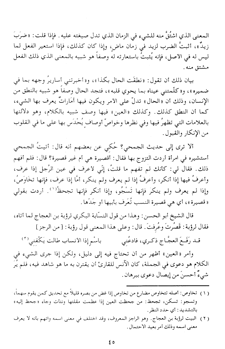 وأمر «العين» أظهر من أن تحتاج فيه إلى دليل، ولكن إذا جرى الشيء في الكلام هو دعوى في الجملة، كان الآنس للقارئ أن يقترن به ما هو شاهد فيه، فلم ير شيء أحسن من إيصال دعوى ببرهان.
