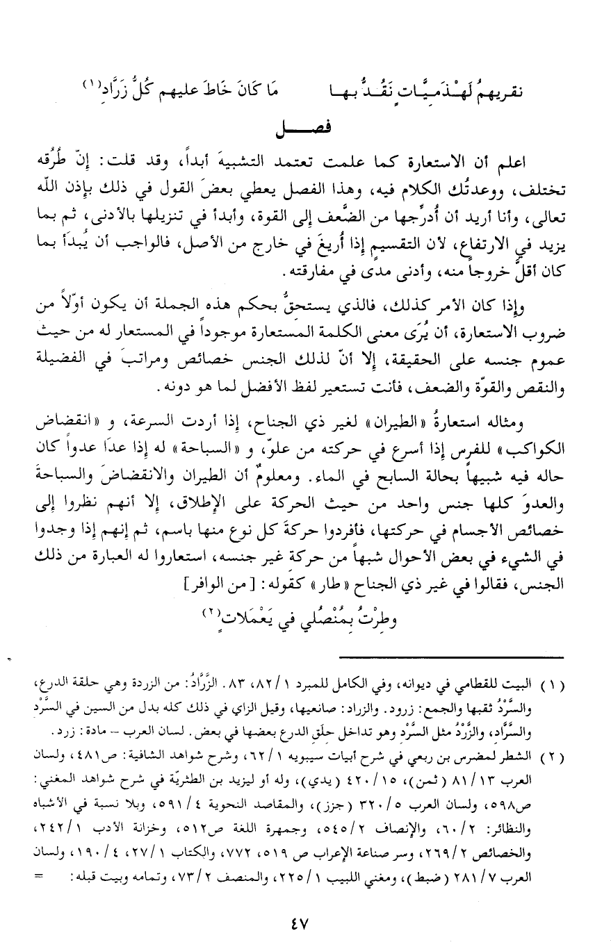 ومثاله استعارة «الطيران» لغير ذي الجناح، إذا أردت السرعة، و «انقضاض الكواكب» للفرس إذا أسرع في حركته من علوّ، و «السباحة» له إذا عدا عدوا كان حاله فيه شبيها بحالة السابح في الماء. ومعلوم أن الطيران والانقضاض والسباحة والعدو كلها جنس واحد من حيث الحركة على الإطلاق، إلا أنهم نظروا إلى خصائص الأجسام في حركتها، فأفردوا حركة كل نوع منها باسم، ثم إنهم إذا وجدوا في الشيء في بعض الأحوال شبها من حركة غير جنسه، استعاروا له العبارة من ذلك الجنس، فقالوا في غير ذي الجناح «طار» كقوله: [من الوافر] وطرت بمنصلي في يعملات (¬2)