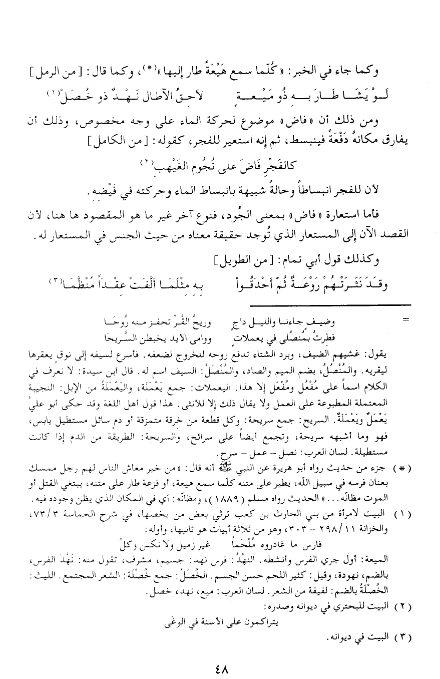 فأما استعارة «فاض» بمعنى الجود، فنوع آخر غير ما هو المقصود هاهنا، لأن القصد الآن إلى المستعار الذي توجد حقيقة معناه من حيث الجنس في المستعار له.
