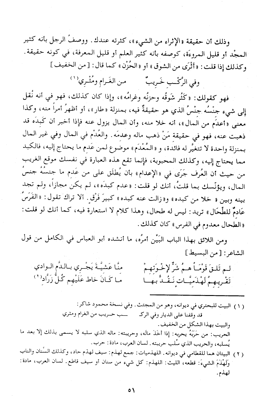 فهو كقولك: «كثر شوقه وحزنه وغرامه»، وإذا كان كذلك، فهو في أنه نقل إلى شيء جنسه جنس الذي هو حقيقة فيه، بمنزلة «طار»، أو أظهر أمرا منه، وكذا معنى «أعدم من المال»، أنه خلا منه، وأن المال يزول عنه فإذا أخبر أن كبده قد ذهبت عنه، فهو في حقيقة من ذهب ماله وعدمه. والعدم في المال وفي غير المال بمنزلة واحدة لا تتغيّر له فائدة، و «المعدم» موضوع لمن عدم ما يحتاج إليه، فالكبد مما يحتاج إليه، وكذلك المحبوبة، فإنما تقع هذه العبارة في نفسك موقع الغريب من حيث أن العرف جرى في «الإعدام» بأن يطلق على من عدم ما جنسه جنس المال، ويؤنّسك بما قلت، أنك لو قلت: «عدم كبده»، لم يكن مجازا، ولم تجد بينه وبين «خلا من كبده» و «زالت عنه كبده» كبير فرق. ألا تراك تقول: «الفرس عادم للطّحال» تريد: ليس له طحال، وهذا كلام لا استعارة فيه، كما أنك لو قلت: