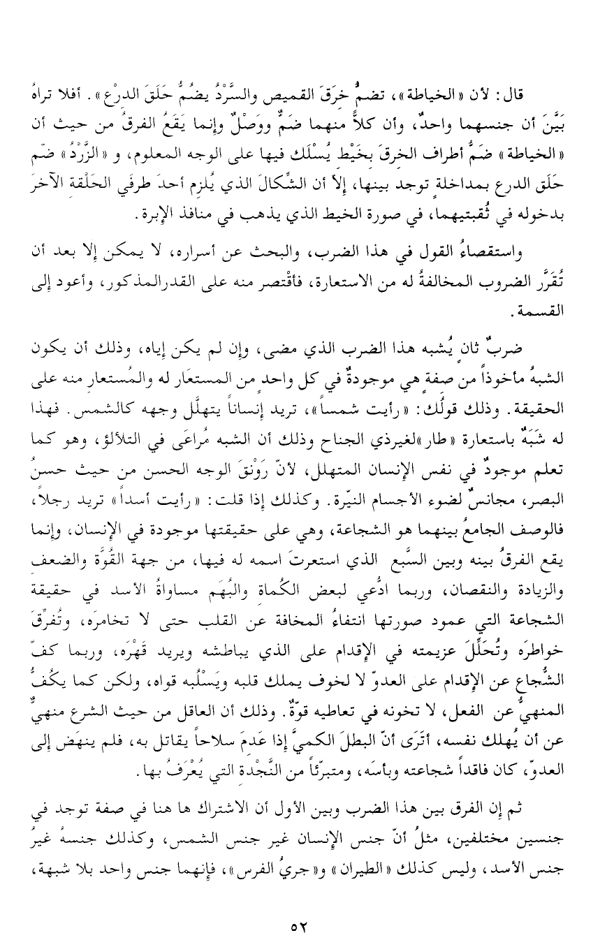 ضرب ثان يشبه هذا الضرب الذي مضى، وإن لم يكن إياه، وذلك أن يكون الشبه مأخوذا من صفة هي موجودة في كل واحد من المستعار له والمستعار منه على الحقيقة. وذلك قولك: «رأيت شمسا»، تريد إنسانا يتهلّل وجهه كالشمس. فهذا له شبه باستعارة «طار» لغير ذي الجناح وذلك أن الشبه مراعى في التلألؤ، وهو كما تعلم موجود في نفس الإنسان المتهلل، لأنّ رونق الوجه الحسن من حيث حسن البصر، مجانس لضوء الأجسام النيّرة. وكذلك إذا قلت: «رأيت أسدا» تريد رجلا، فالوصف الجامع بينهما هو الشجاعة، وهي على حقيقتها موجودة في الإنسان، وإنما يقع الفرق بينه وبين السّبع الذي استعرت اسمه له فيها، من جهة القوّة والضعف والزيادة والنقصان، وربما ادّعي لبعض الكماة والبهم مساواة الأسد في حقيقة الشجاعة التي عمود صورتها انتفاء المخافة عن القلب حتى لا تخامره، وتفرّق خواطره وتحلّل عزيمته في الإقدام على الذي يباطشه ويريد قهره، وربما كفّ الشّجاع عن الإقدام على العدوّ لا لخوف يملك قلبه ويسلبه قواه، ولكن كما يكفّ المنهيّ عن الفعل، لا تخونه في تعاطيه قوّة. وذلك أن العاقل من حيث الشرع منهيّ عن أن يهلك نفسه، أترى أنّ البطل الكميّ إذا عدم سلاحا يقاتل به، فلم ينهض إلى العدوّ، كان فاقدا شجاعته وبأسه، ومتبرّئا من النّجدة التي يعرف بها.