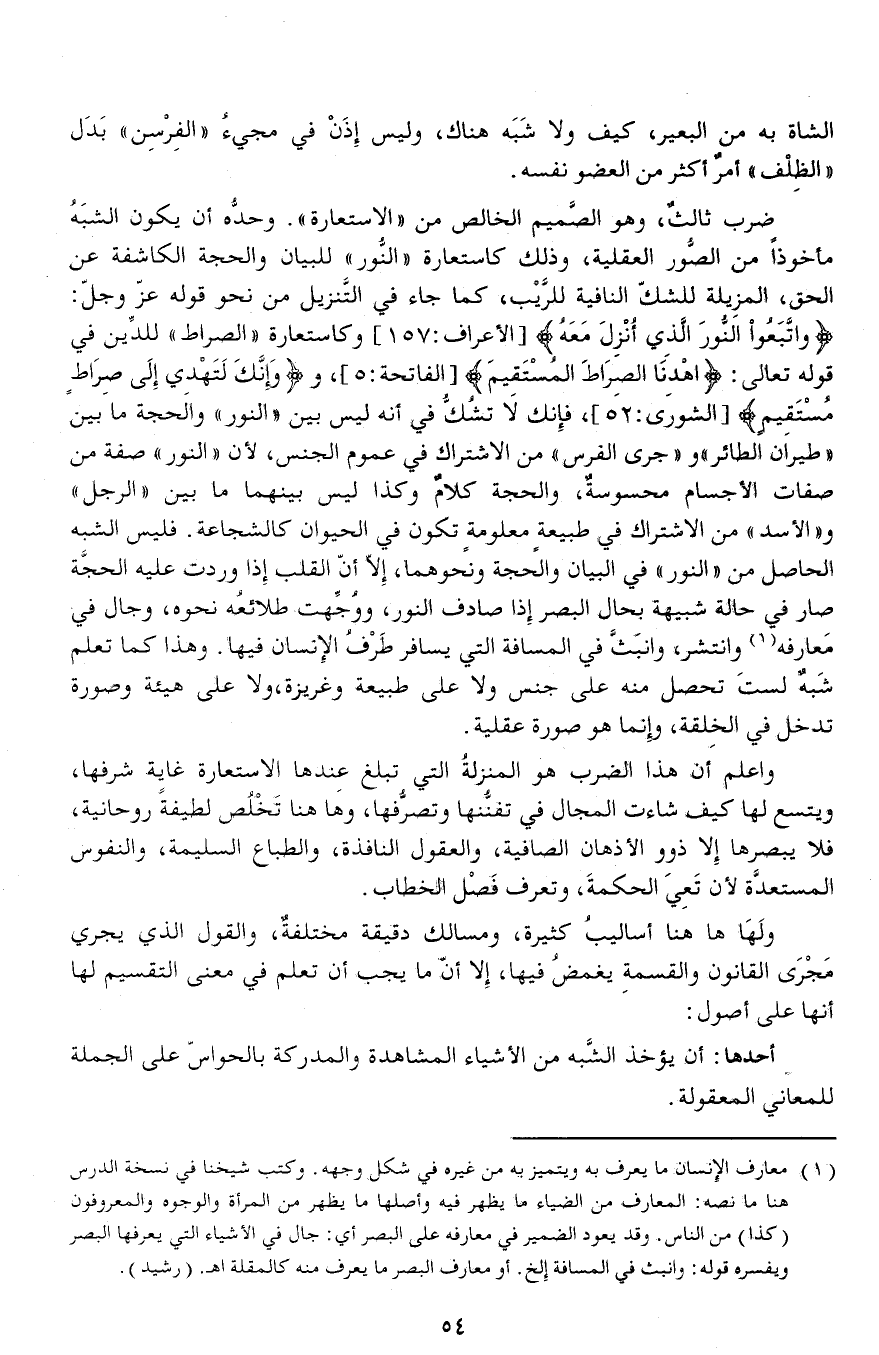 وَاتَّبَعُوا النُّورَ الَّذِي أُنْزِلَ مَعَهُ [الأعراف: 157] وكاستعارة «الصراط» للدّين في قوله تعالى: اهْدِنَا الصِّراطَ الْمُسْتَقِيمَ [الفاتحة: 5]، ووَ إِنَّكَ لَتَهْدِي إِلى صِراطٍ مُسْتَقِيمٍ [الشورى: 52]، فإنك لا تشكّ في أنه ليس بين «النور» والحجة ما بين «طيران الطائر» و «جرى الفرس» من الاشتراك في عموم الجنس، لأن «النور» صفة من صفات الأجسام محسوسة، والحجة كلام وكذا ليس بينهما ما بين «الرجل» و «الأسد» من الاشتراك في طبيعة معلومة تكون في الحيوان كالشجاعة. فليس الشبه الحاصل من «النور» في البيان والحجة ونحوهما، إلّا أنّ القلب إذا وردت عليه الحجّة صار في حالة شبيهة بحال البصر إذا صادف النور، ووجّهت طلائعه نحوه، وجال في معارفه (¬1) وانتشر، وانبثّ في المسافة التي يسافر طرف الإنسان فيها. وهذا كما تعلم شبه لست تحصل منه على جنس ولا على طبيعة وغريزة، ولا على هيئة وصورة تدخل في الخلقة، وإنما هو صورة عقلية.
