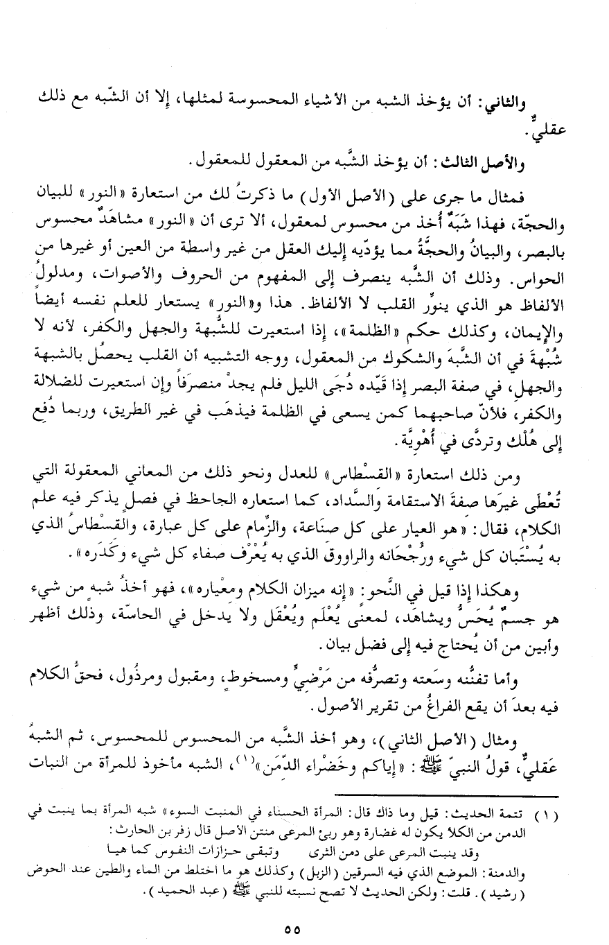 وهكذا إذا قيل في النّحو: «إنه ميزان الكلام ومعياره»، فهو أخذ شبه من شيء هو جسم يحسّ ويشاهد، لمعنى يعلم ويعقل ولا يدخل في الحاسّة، وذلك أظهر وأبين من أن يحتاج فيه إلى فضل بيان.