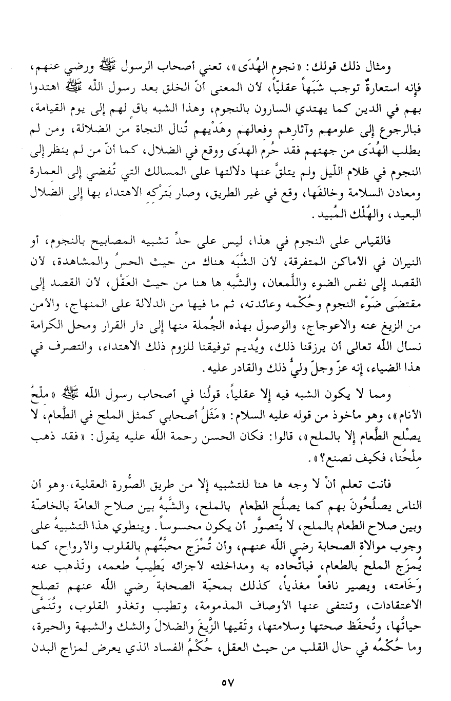 فالقياس على النجوم في هذا، ليس على حدّ تشبيه المصابيح بالنجوم، أو النيران في الأماكن المتفرقة، لأن الشّبه هناك من حيث الحس والمشاهدة، لأن القصد إلى نفس الضوء واللّمعان، والشّبه هاهنا من حيث العقل، لأن القصد إلى مقتضى ضوء النجوم وحكمه وعائدته، ثم ما فيها من الدلالة على المنهاج، والأمن من الزيغ عنه والاعوجاج، والوصول بهذه الجملة منها إلى دار القرار ومحل الكرامة نسأل الله تعالى أن يرزقنا ذلك، ويديم توفيقنا للزوم ذلك الاهتداء، والتصرف في هذا الضياء، إنه عزّ وجلّ وليّ ذلك والقادر عليه.