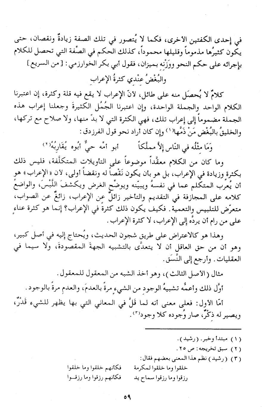 في إحدى الكفتين الأخرى، فكما لا يتصور في تلك الصفة زيادة ونقصان، حتى يكون كثيرها مذموما وقليلها محمودا، كذلك الحكم في الصّفة زيادة ونقصان، حتى يكون كثيرها مذموما وقليلها محمودا، كذلك الحكم في الصّفة التي تحصل للكلام بإجرائه على حكم النحو ووزنه بميزان، فقول أبي بكر الخوارزمي: [من السريع] والبغض عندي كثرة الإعراب كلام لا يحصل منه على طائل، لأنّ الإعراب لا يقع فيه قلة وكثرة، إن اعتبرنا الكلام الواحد والجملة الواحدة، وإن اعتبرنا الجمل الكثيرة وجعلنا إعراب هذه الجملة مضموما إلى إعراب تلك، فهي الكثرة التي لا بدّ منها، ولا صلاح مع تركها، والخليق بالبغض من ذمّها (¬1) وإن كان أراد نحو قول الفرزدق: