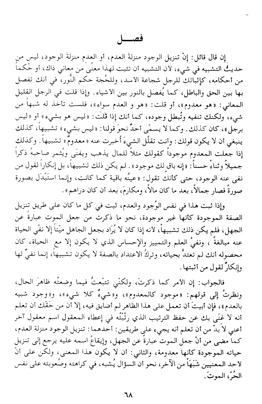 إن قال قائل: إنّ تنزيل الوجود منزلة العدم، أو العدم منزلة الوجود، ليس من حديث التشبيه في شيء، لأن التشبيه أن تثبت لهذا معنى من معاني ذاك، أو حكما من أحكامه، كإثباتك للرجل شجاعة الأسد، وللحجة حكم النّور، في أنك تفصل بها بين الحق والباطل، كما يفصل بالنور بين الأشياء. وإذا قلت في الرجل القليل المعاني: «هو معدوم»، أو قلت: «هو والعدم سواء»، فلست تأخذ له شبها من شيء، ولكنك تنفيه وتبطل وجوده، كما أنك إذا قلت: «ليس هو بشيء» أو «ليس برجل»، كان كذلك. وكما لا يسمّى أحد نحو قولنا: «ليس بشيء» تشبيها، كذلك ينبغي أن لا يكون قولك: وأنت تقلّل الشيء أخبرت عنه «معدوم» تشبيها. وكذلك إذا جعلت المعدوم موجودا كقولك مثلا للمال يذهب ويفنى ويثمر صاحبه ذكرا جميلا وثناء حسنا: «إنه باق لك موجود». لم يكن ذلك تشبيها، بل إنكارا لقول من نفى عنه الوجود، حتى كأنك تقول: «عينه باقية كما كانت، وإنما استبدل بصورة صورة فصار جمالا، بعد ما كان مالا، ومكارم، بعد أن كان دراهم».