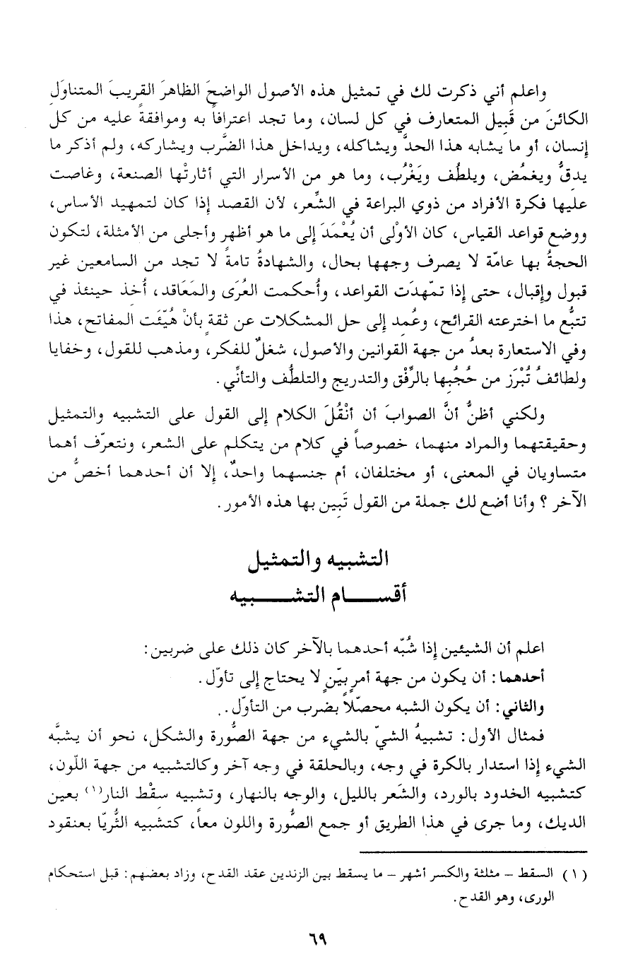 ولكني أظنّ أنّ الصواب أن أنقل الكلام إلى القول على التشبيه والتمثيل وحقيقتهما والمراد منهما، خصوصا في كلام من يتكلم على الشعر، ونتعرّف أهما متساويان في المعنى، أو مختلفان، أم جنسهما واحد، إلا أن أحدهما أخصّ من الآخر؟ وأنا أضع لك جملة من القول تبين بها هذه الأمور.