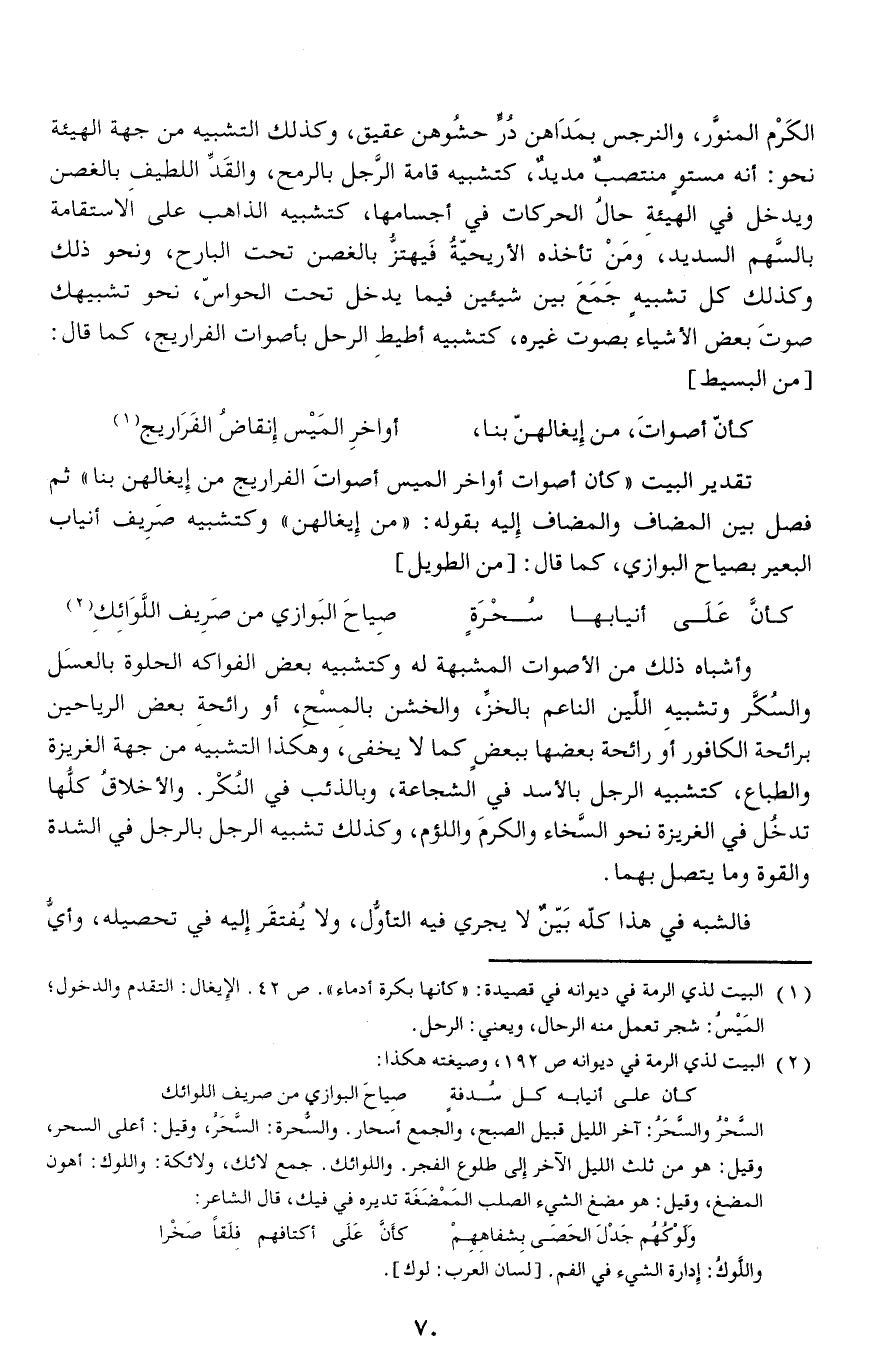 وأشباه ذلك من الأصوات المشبهة له وكتشبيه بعض الفواكه الحلوة بالعسل والسكّر وتشبيه اللّين الناعم بالخزّ، والخشن بالمسح، أو رائحة بعض الرياحين برائحة الكافور أو رائحة بعضها ببعض كما لا يخفى، وهكذا التشبيه من جهة الغريزة والطباع، كتشبيه الرجل بالأسد في الشجاعة، وبالذئب في النكر. والأخلاق كلّها تدخل في الغريزة نحو السّخاء والكرم واللؤم، وكذلك تشبيه الرجل بالرجل في الشدة والقوة وما يتصل بهما.