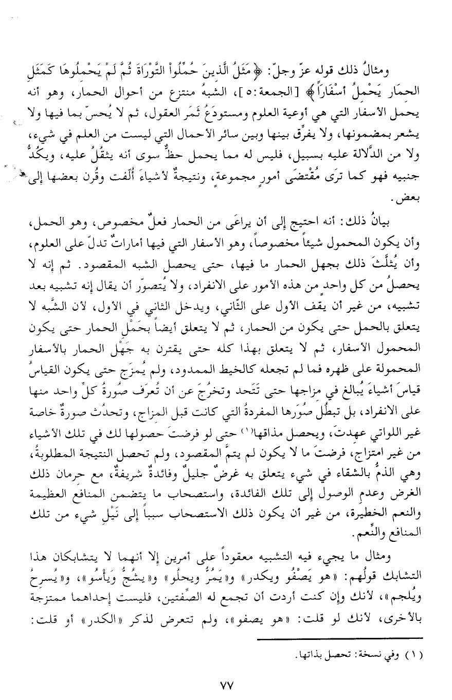 بيان ذلك: أنه احتيج إلى أن يراعى من الحمار فعل مخصوص، وهو الحمل، وأن يكون المحمول شيئا مخصوصا، وهو الأسفار التي فيها أمارات تدلّ على العلوم، وأن يثلّث ذلك بجهل الحمار ما فيها، حتى يحصل الشبه المقصود. ثم إنه لا يحصل من كل واحد من هذه الأمور على الانفراد، ولا يتصوّر أن يقال إنه تشبيه بعد تشبيه، من غير أن يقف الأول على الثّاني، ويدخل الثاني في الأول، لأن الشّبه لا يتعلق بالحمل حتى يكون من الحمار، ثم لا يتعلق أيضا بحمل الحمار حتى يكون المحمول الأسفار، ثم لا يتعلق بهذا كله حتى يقترن به جهل الحمار بالأسفار المحمولة على ظهره فما لم تجعله كالخيط الممدود، ولم يمزج حتى يكون القياس قياس أشياء يبالغ في مزاجها حتى تتحد وتخرج عن أن تعرف صورة كلّ واحد منها على الانفراد، بل تبطل صورها المفردة التي كانت قبل المزاج، وتحدث صورة خاصة غير اللواتي عهدت، ويحصل مذاقها (¬1) حتى لو فرضت حصولها لك في تلك الأشياء من غير امتزاج، فرضت ما لا يكون لم يتمّ المقصود، ولم تحصل النتيجة المطلوبة، وهي الذمّ بالشقاء في شيء يتعلق به غرض جليل وفائدة شريفة، مع حرمان ذلك الغرض وعدم الوصول إلى تلك الفائدة، واستصحاب ما يتضمن المنافع العظيمة والنعم الخطيرة، من غير أن يكون ذلك الاستصحاب سببا إلى نيل شيء من تلك المنافع والنّعم.