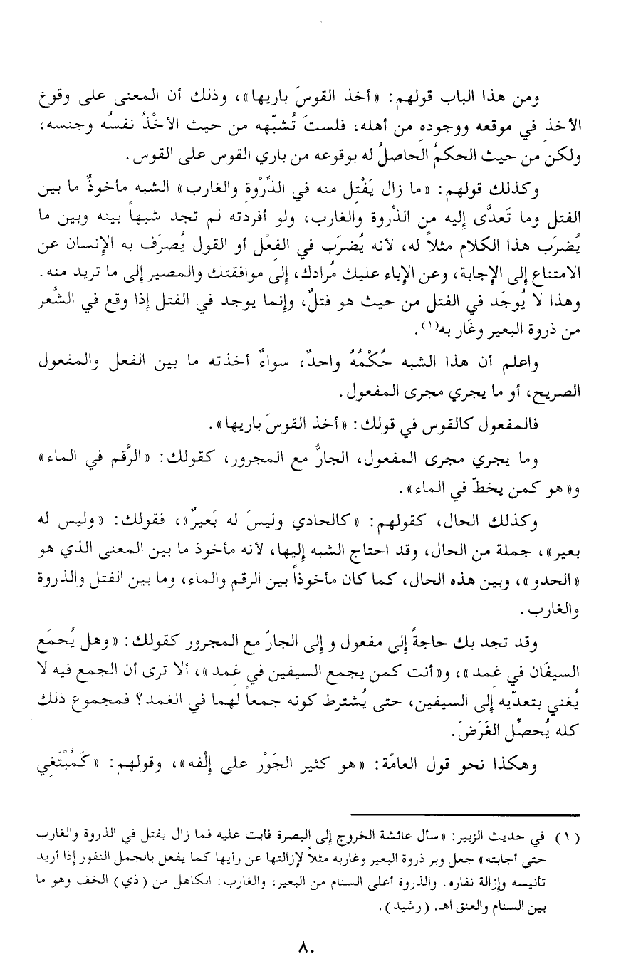 ومن هذا الباب قولهم: «أخذ القوس باريها»، وذلك أن المعنى على وقوع الأخذ في موقعه ووجوده من أهله، فلست تشبّهه من حيث الأخذ نفسه وجنسه، ولكن من حيث الحكم الحاصل له بوقوعه من باري القوس على القوس.