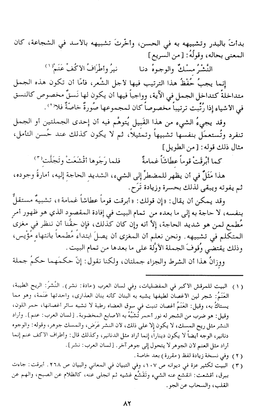 (¬1) البيت للمرقش الأكبر في المفضليات، وفي لسان العرب (مادة: نشر). النّشر: الريح الطيبة، العنم: شجر لين الأغصان لطيفها يشبه به البنان كأنه بنان العذارى، واحدتها عنمة، وهو مما يستاك به، وقيل: العنم أغصان تنبت في سوق العضاه رطبة لا تشبه سائر أغصانها، حمر اللون، وقيل: هو ضرب من الشجر له نور أحمر تشبّه به الأصابع المخضوبة. [لسان العرب: عنم]. وأراد النشر مثل ريح المسك، لا يكون إلا على ذلك، لأن النشر عرض، والمسك جوهر، وقوله: والوجوه دنانير، الوجه أيضا لا يكون دينارا، إنما أراد مثل الدنانير، وكذلك قال: وأطراف الأكف عنم إنما أراد مثل العنم لأن الجوهر لا يتحول إلى جوهر آخر. [لسان العرب: نشر].