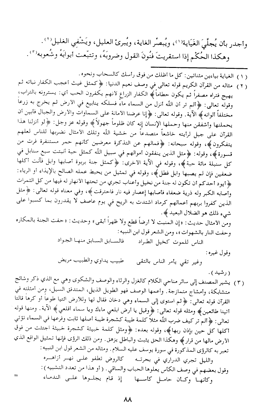 ومن الأمثال حديث: «إن المنبت لا أرضا قطع ولا ظهرا أبقى» وحديث: «حفت الجنة بالمكاره وحفت النار بالشهوات»، ومن الشعر قول ابن النبيه: